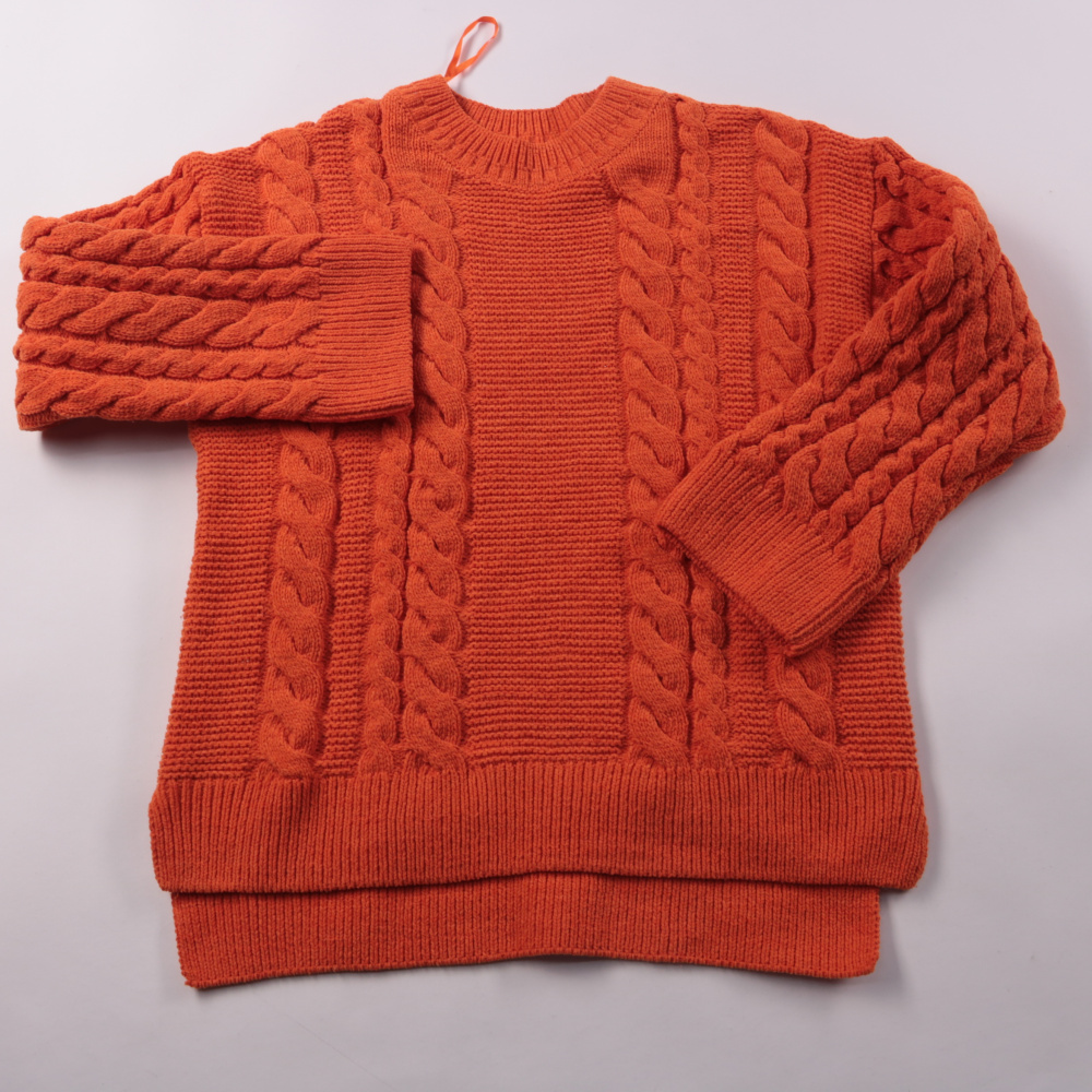 Вязаный свитер Gallery в ярком оранжевом цвете с рельефным узором «косы» и круглым воротом. Подойдёт для прохладной погоды и многослойных образов с джинсами или юбкой. Плотная вязка хорошо держит форму и комфортно согревает.
