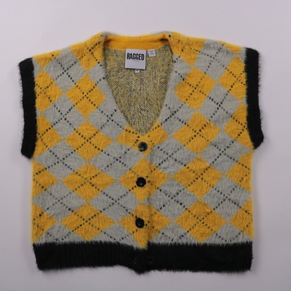 Кардиган Ragged Jeans с V-образным вырезом и застёжкой на пуговицы, выполнен из пушистой пряжи с ромбовым узором в жёлто-серо-чёрной гамме. Подойдёт для демисезона и прохладного лета, удобно сочетать с джинсами или юбкой. Практичный плюс — лёгкий, быст...