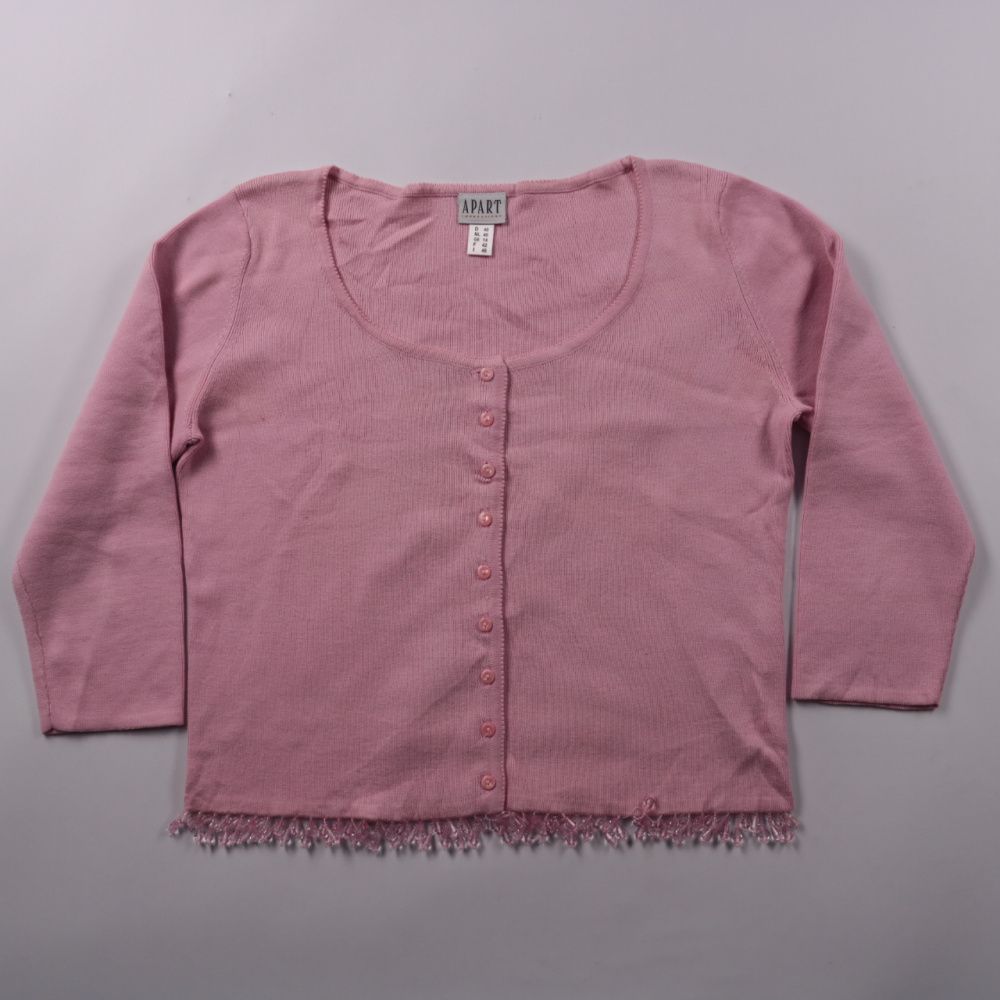 Кардиган Apart нежно-розового цвета из 100% хлопка, на пуговицах и с декоративной бахромой по низу. Подойдёт для повседневных образов и офисных комплектов с топом или платьем в тёплую погоду и в помещении. Хлопок приятен к телу и хорошо дышит, а застёж...