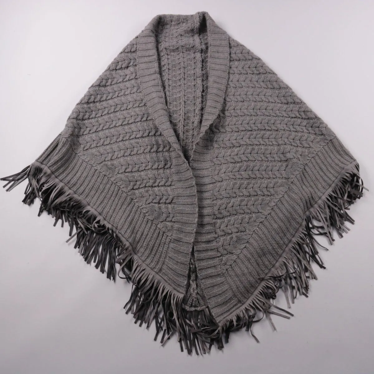 Вязаный кардиган с узором косы и бахромой по краю. Подойдёт для прохладной погоды и многослойных образов с пальто или курткой. Мягкий объём хорошо держит форму и удобно драпируется.