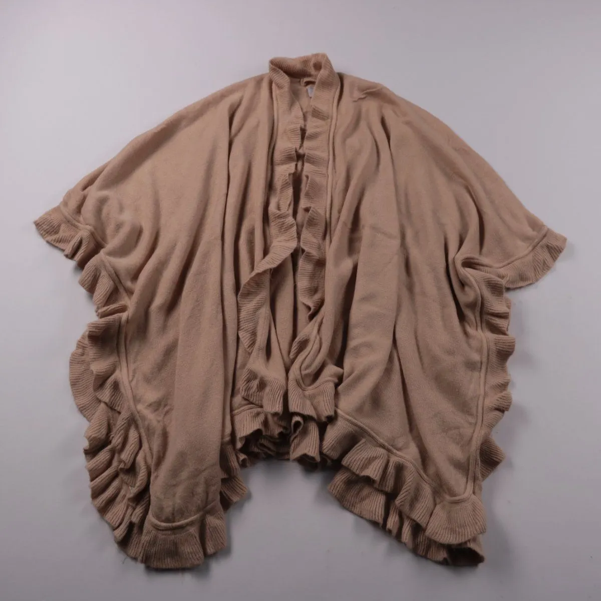 Женский кардиган-пончо Next бежевого цвета с рюшами по краям и свободной посадкой. Подойдёт для повседневных образов и как накидка поверх топа/платья в прохладную погоду. Мягкий трикотаж хорошо драпируется и не стесняет движений.
