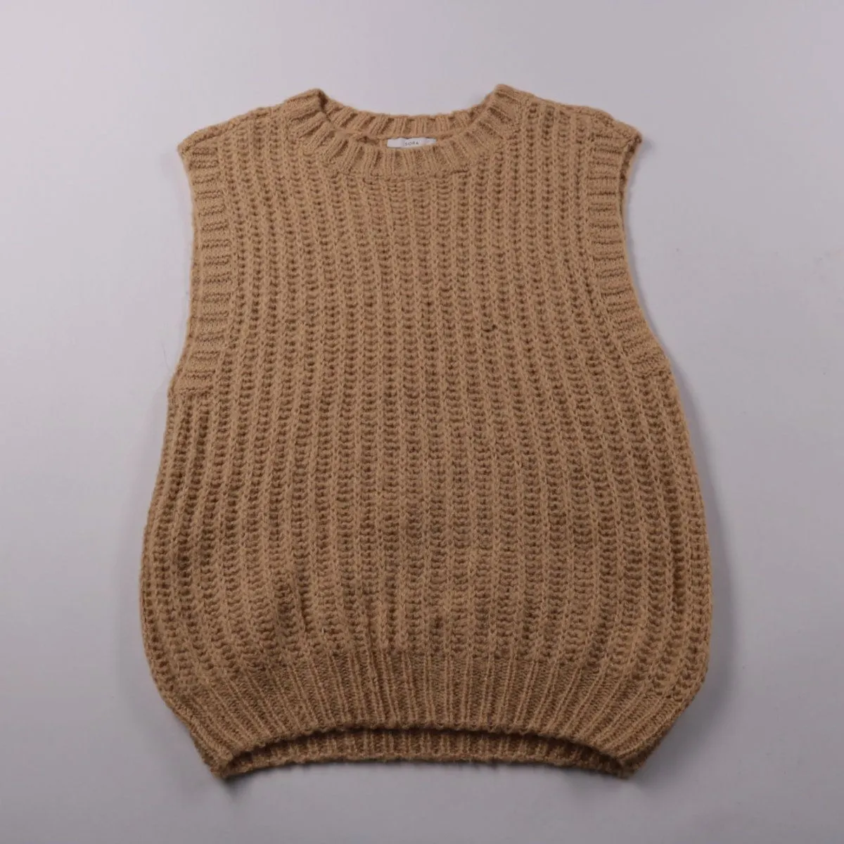 Вязаный жилет SORA в бежевом цвете крупной резинки, без рукавов и с круглым вырезом. Хорошо подойдёт для многослойных образов с рубашкой или лонгсливом в прохладную погоду. Практичный плюс — объёмная вязка держит форму и добавляет тепла без лишней тяжести.