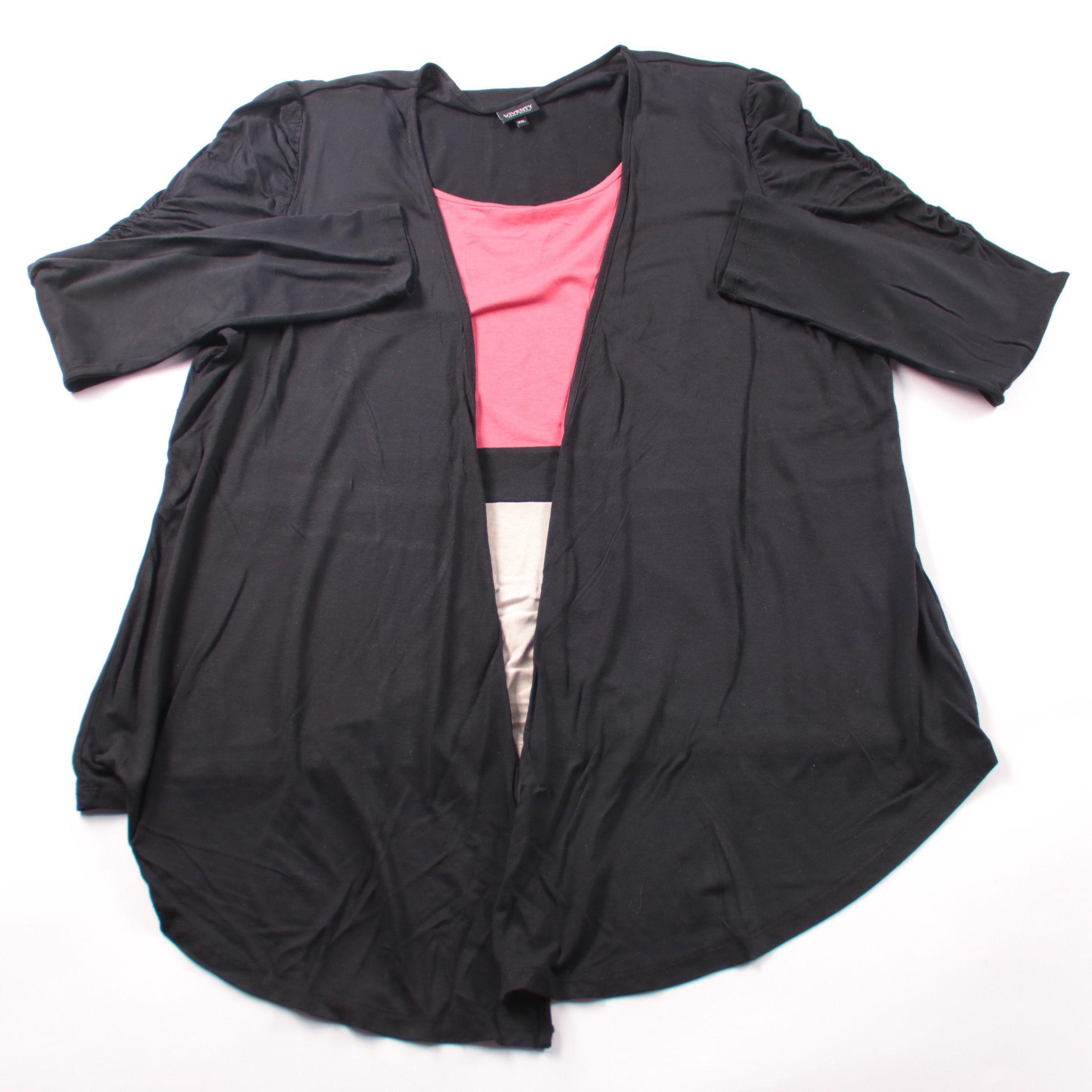 Женский кардиган Viventy Bernd Berger чёрного цвета с открытым передом и рукавами 3/4, с контрастной вставкой спереди (розовый/бежевый). Подойдёт для офиса и повседневных образов как лёгкий верхний слой. Трикотаж на основе вискозы тянется и комфортно с...