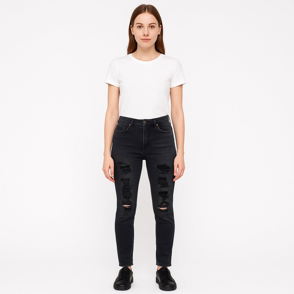 Женские джинсы Janina Skinny из чёрного денима с декоративными потертостями и разрезами на коленях. Подойдут для повседневных образов с футболками, худи и косухой в любой сезон. Эластичная ткань комфортно садится по фигуре и не стесняет движения.
