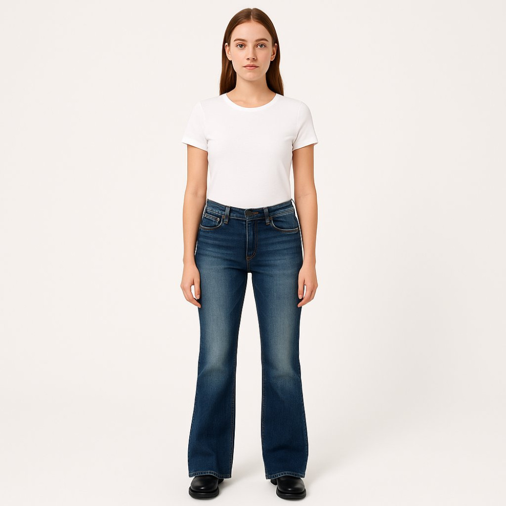 Женские джинсы Only (линейка Limitless Denim) синего цвета с небольшим клёшем от колена. Подойдут для повседневных образов с кедами или ботинками в любой сезон. Эластичная ткань делает посадку более комфортной и не сковывает движения.