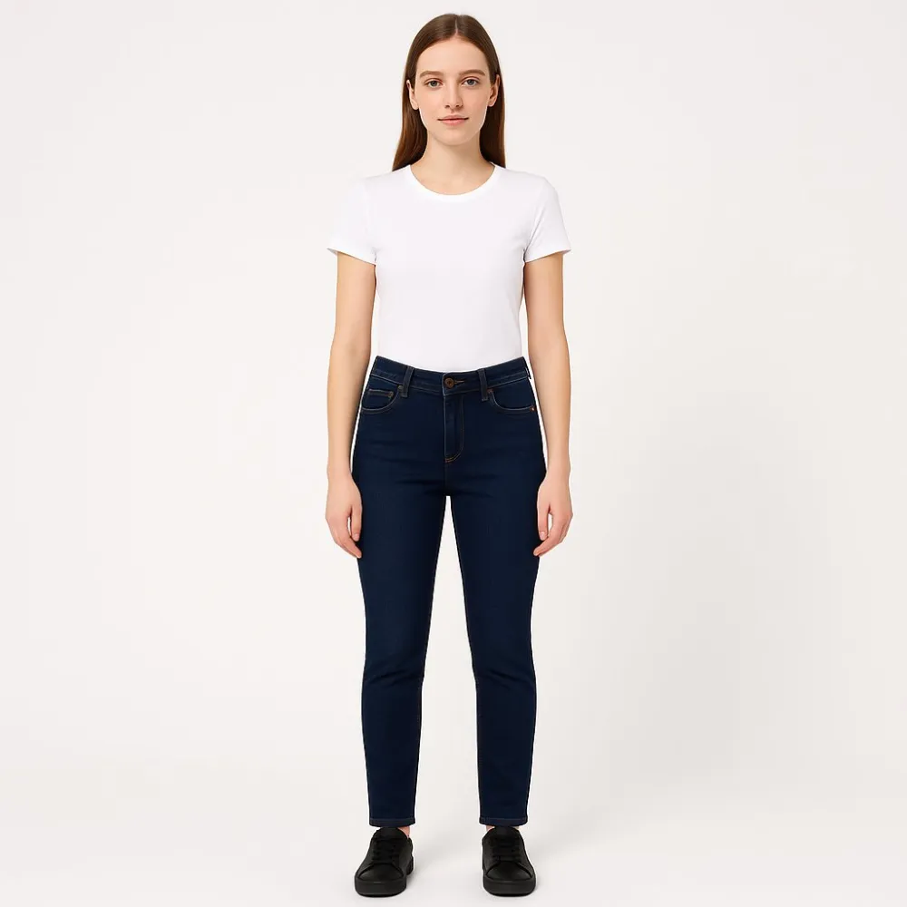 Женские тёмно-синие джинсы Denim с классической посадкой и слегка зауженным силуэтом. Подойдут для повседневных образов с футболками, рубашками и кедами. Плотный хлопковый деним со стрейчем хорошо держит форму и не стесняет движения.