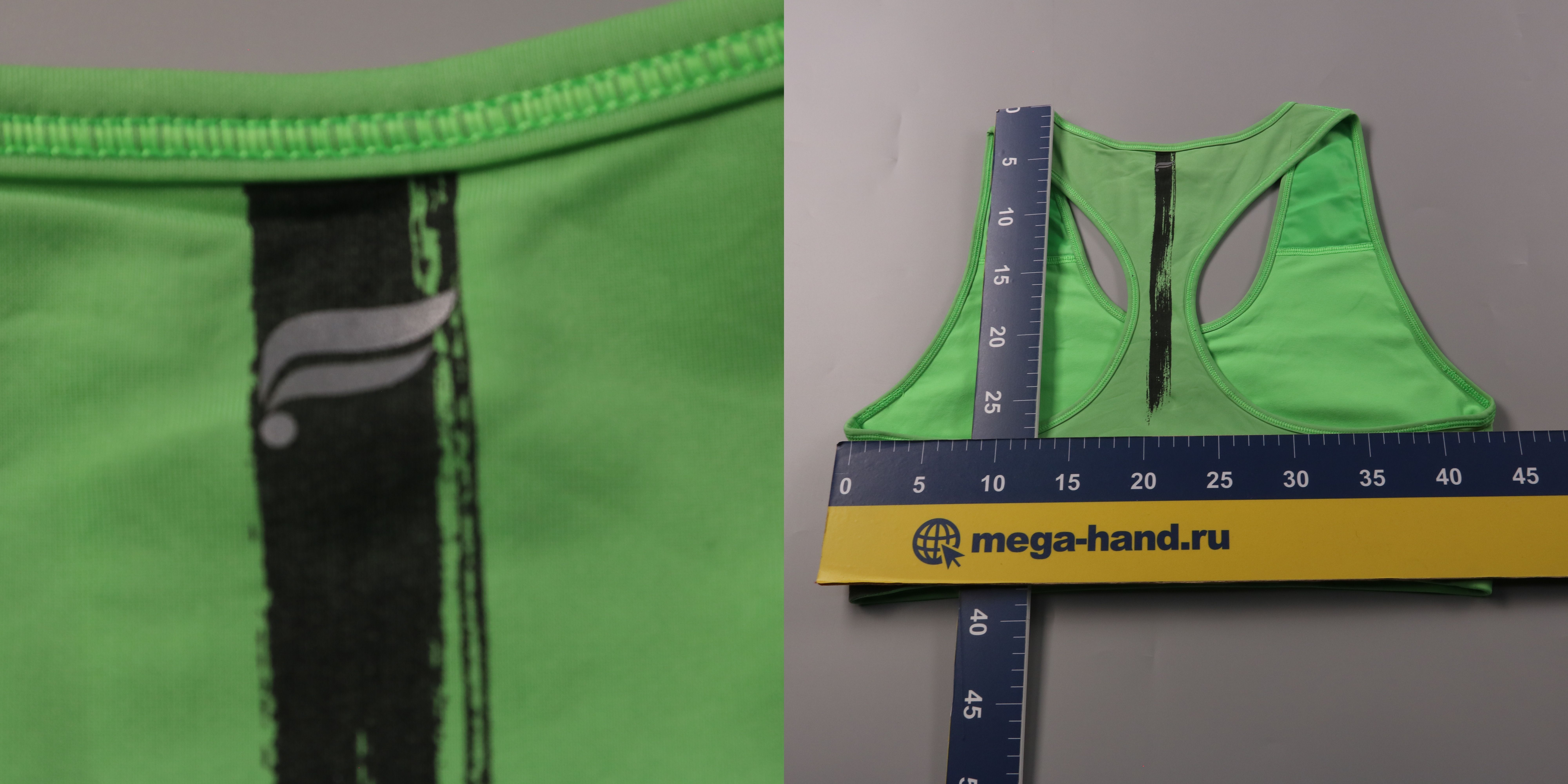 Спортивный топ-бра с борцовской спинкой и контрастным чёрным принтом, бренд на бирке не читается. Подойдёт для тренировок, йоги и бега, хорошо сидит за счёт эластичного материала. Быстро сохнет и удобно поддерживает грудь во время движения.