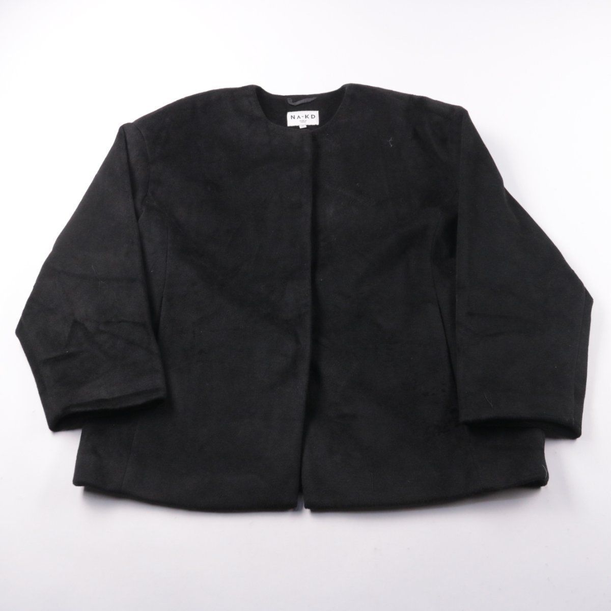 Женский пиджак NA-KD чёрного цвета, укороченный и без лацканов, с лаконичным силуэтом. Подойдёт для офиса и повседневных образов с брюками или платьем. Практичный материал из полиэстера проще в уходе и меньше мнётся.