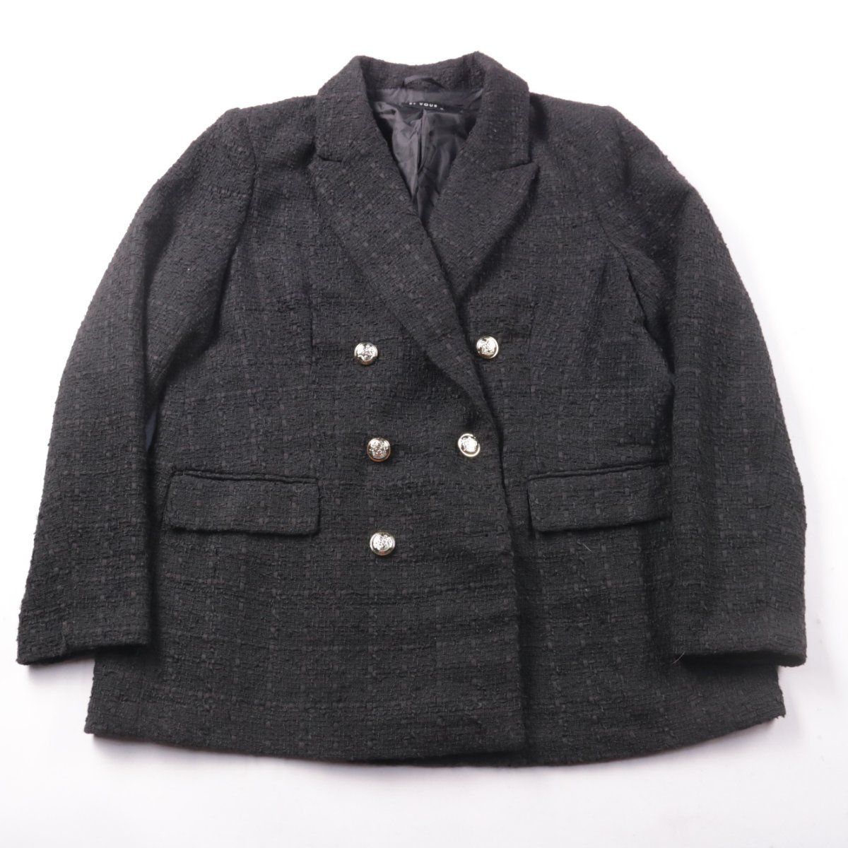Двубортный женский пиджак Et Vous из фактурной ткани с металлическими пуговицами и клапанами карманов. Подойдёт для офиса и аккуратных повседневных образов в прохладную погоду. Полиэстеровая ткань и подкладка практичны в уходе и хорошо держат форму.