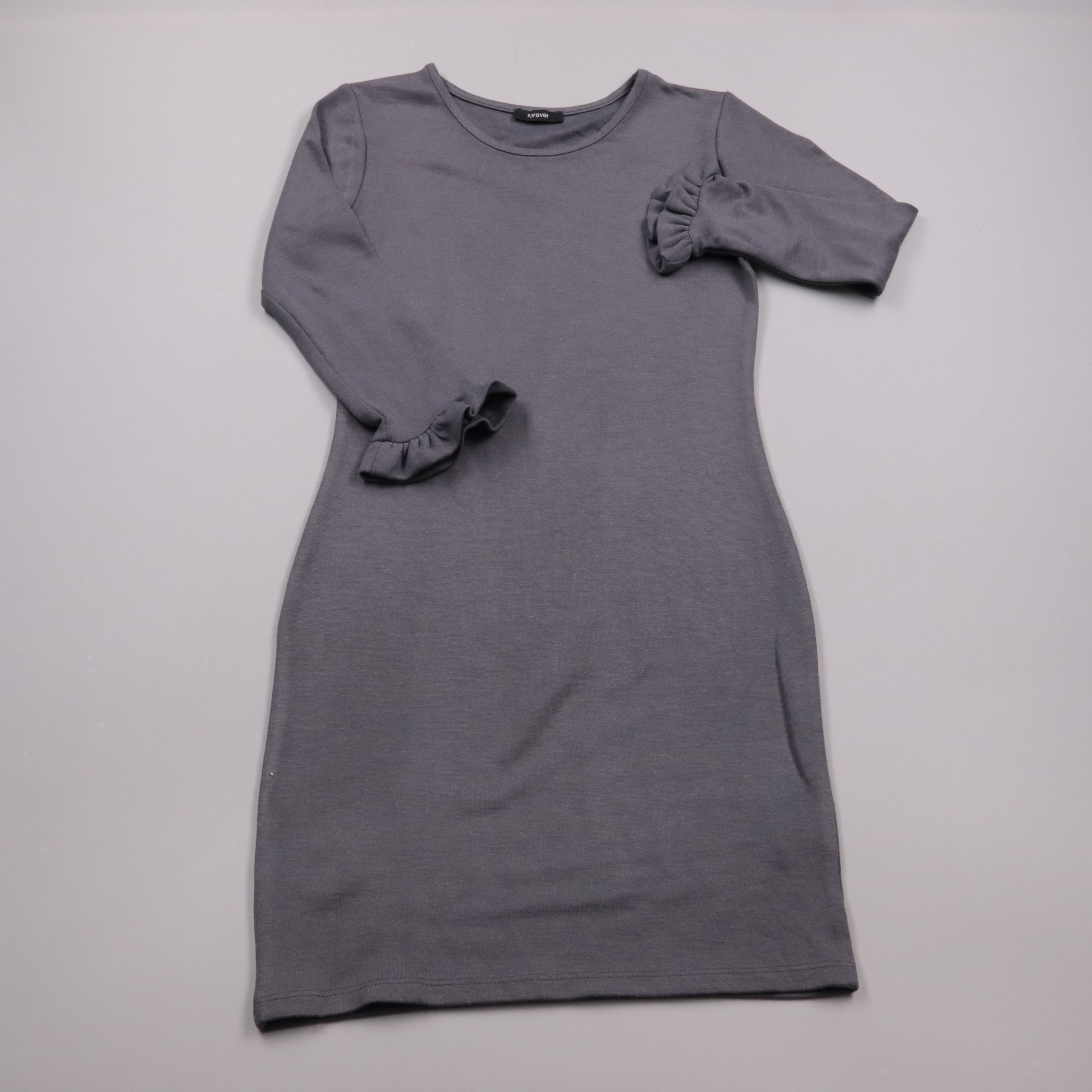 Повседневное платье Forever серого цвета, прямого облегающего кроя с рукавами 3/4 и небольшими воланами на манжетах. Подойдёт для офиса и на каждый день, легко сочетается с жакетом или кедами. Тянущаяся ткань хорошо садится по фигуре и не сковывает дви...