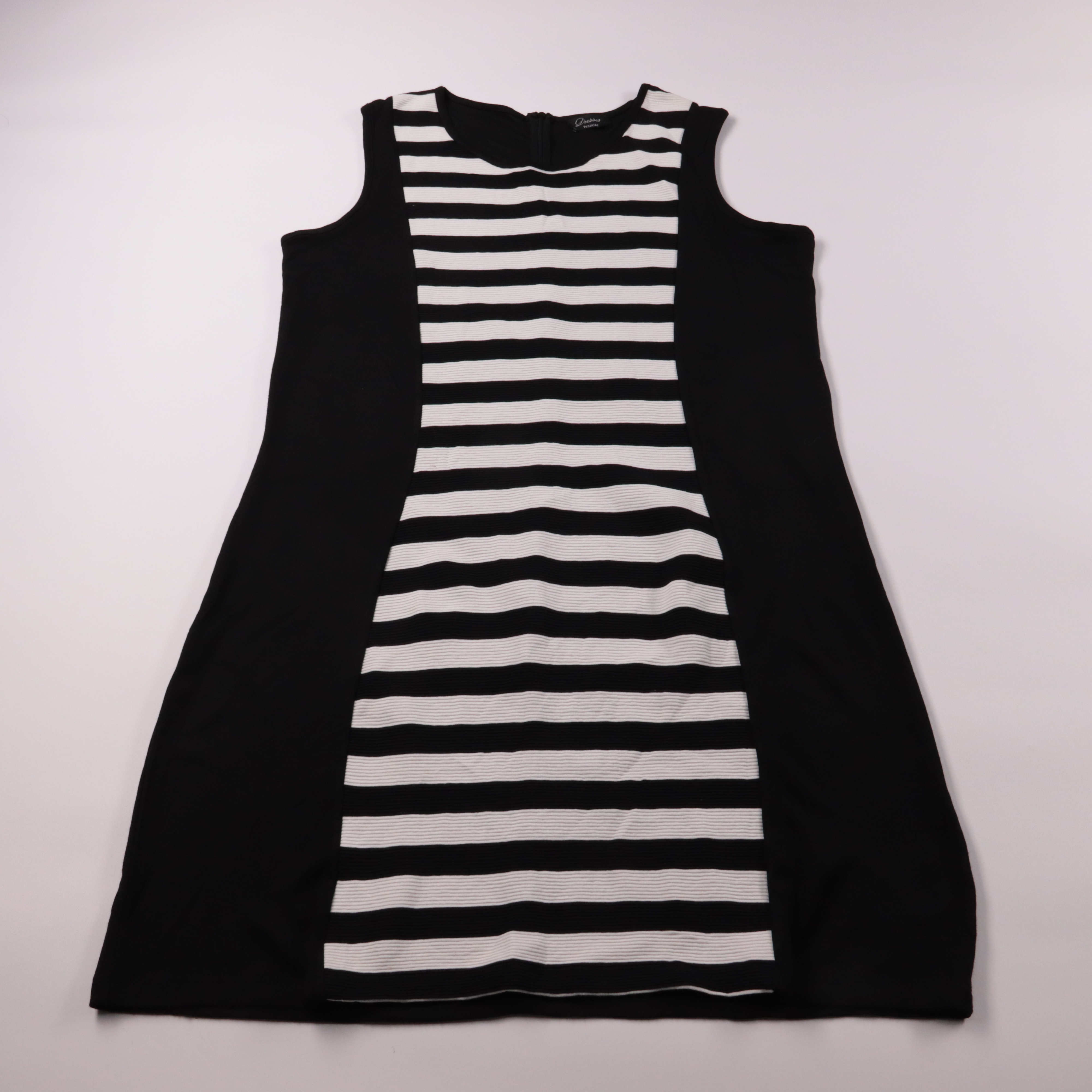 Повседневное платье Yessica без рукавов, чёрное с контрастной вставкой в бело-чёрную полоску спереди. Подойдёт для офиса и на каждый день, легко сочетать с жакетом или кардиганом. Практичный плюс — немаркий цвет и лаконичный фасон, который удобно носит...