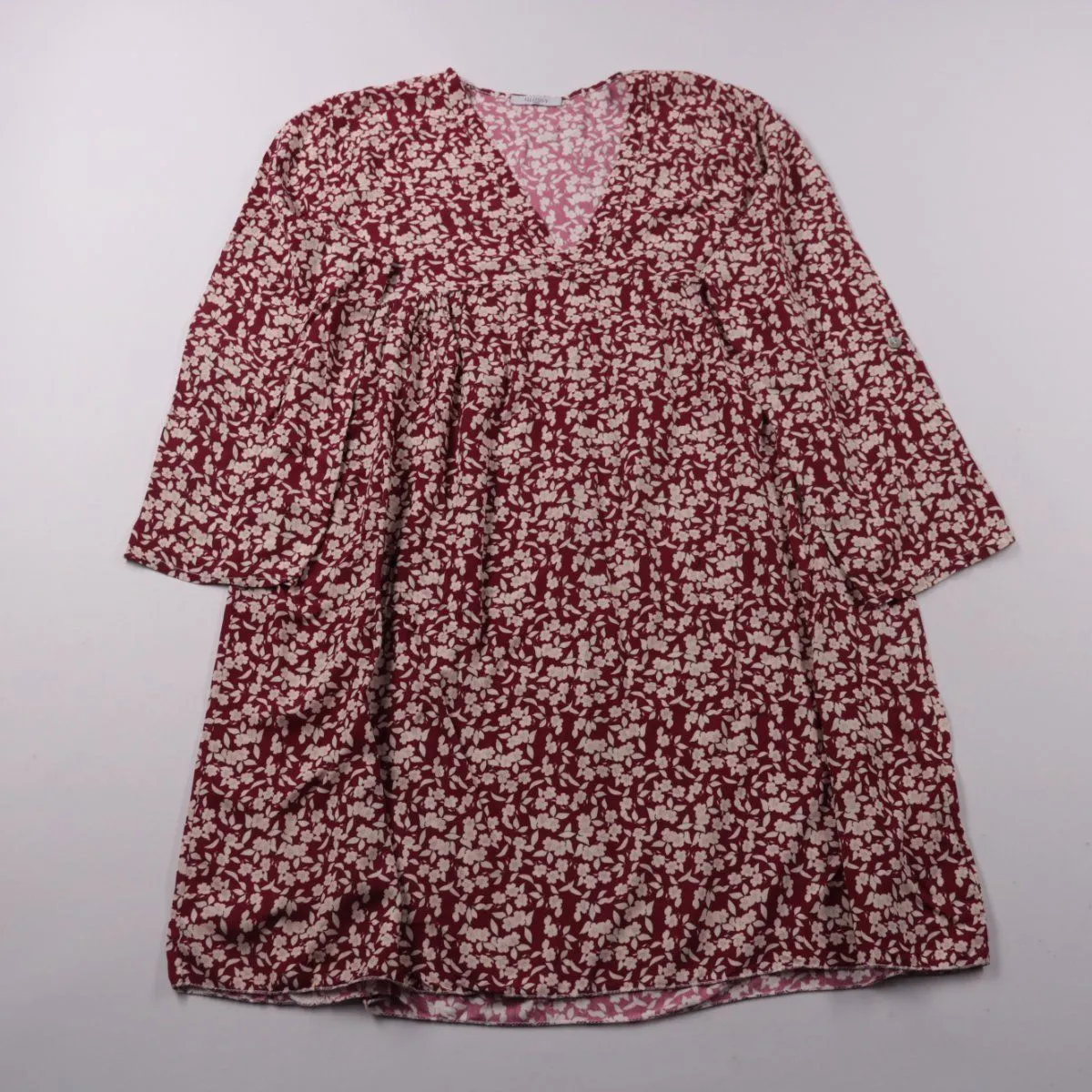 Повседневное платье Glossy бордового цвета с мелким белым цветочным принтом и V‑образным вырезом. Подойдёт для прогулок и повседневных выходов в тёплую погоду, свободный крой не стесняет движений. Вискоза 100% — ткань лёгкая и дышащая, удобно носить целый день.