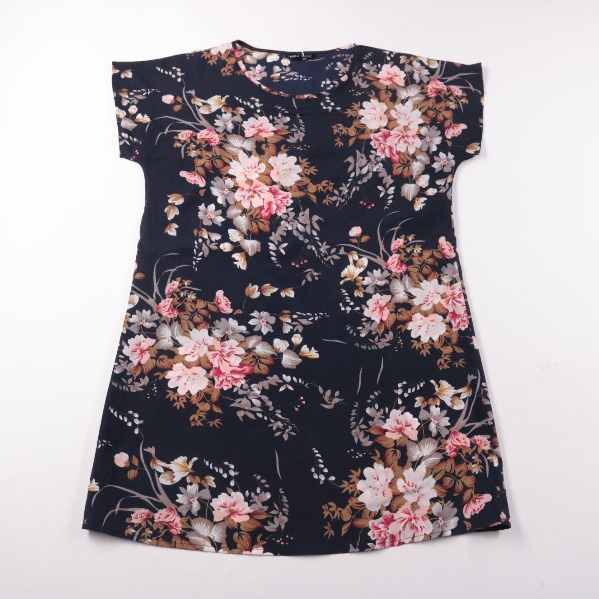 Повседневное платье SHEIN свободного кроя с коротким рукавом и круглым вырезом, на тёмной основе с цветочным принтом. Подойдёт для прогулок и повседневных образов в тёплую погоду, легко сочетается с кедами или босоножками. Практичный плюс — не требует сложной стилизации, достаточно базовой обуви и аксессуаров.