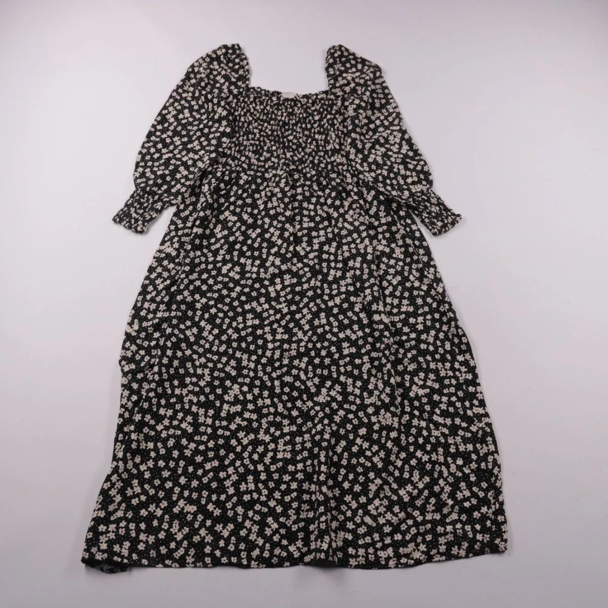 Повседневное платье H&M из вискозы с черной основой и мелким белым цветочным принтом. Подойдёт для прогулок и повседневных образов в тёплую погоду благодаря свободному крою и рукавам-фонарикам. Легкая ткань комфортно ощущается на теле и проста в уходе.