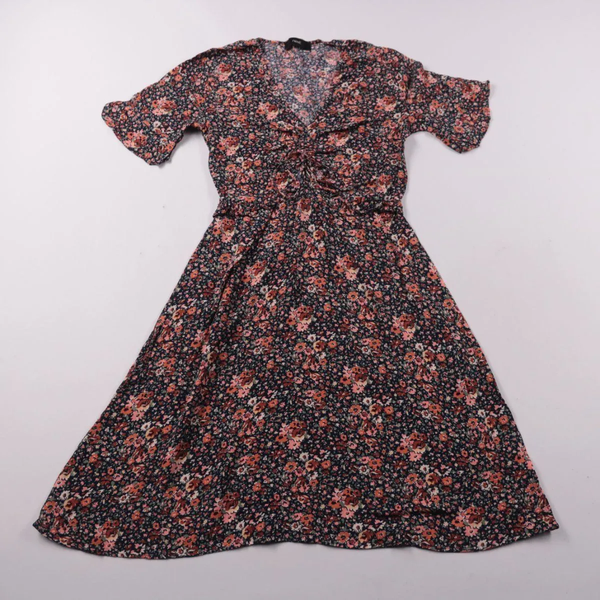 Повседневное платье Next из лёгкой вискозы с цветочным принтом, V-образным вырезом и короткими рукавами. Сборка/узел в зоне талии подчёркивает силуэт и делает модель удобной для прогулок и повседневных выходов. Вискоза хорошо дышит и комфортна в тёплую погоду.