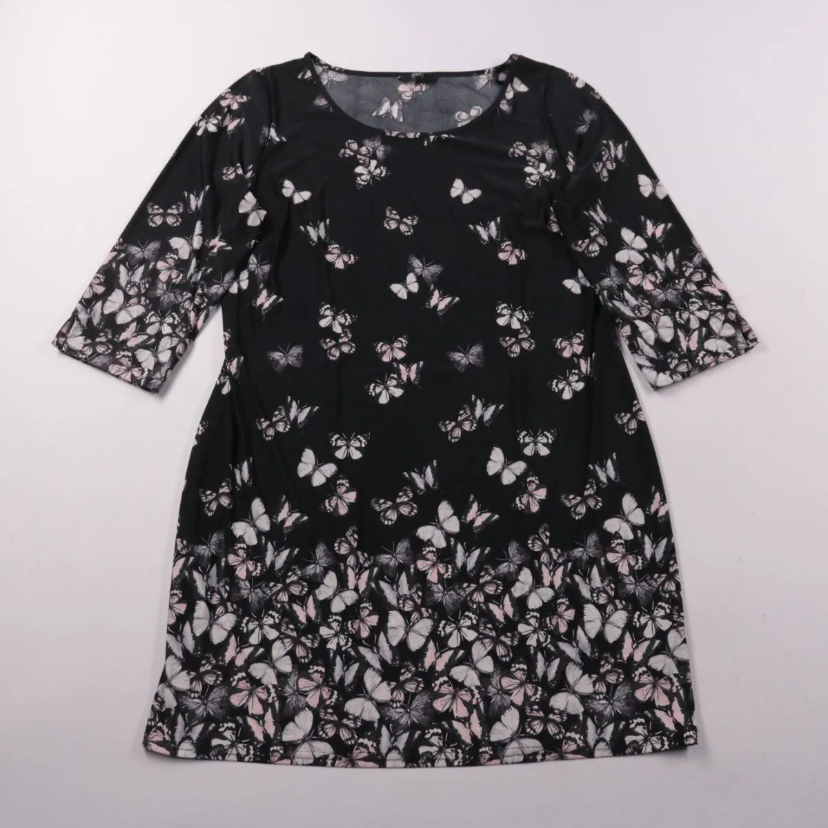 Повседневное платье F&F чёрного цвета с принтом бабочек и рукавами 3/4. Подойдёт для повседневной носки, офиса или прогулок. Ткань эластичная, поэтому комфортно садится по фигуре.