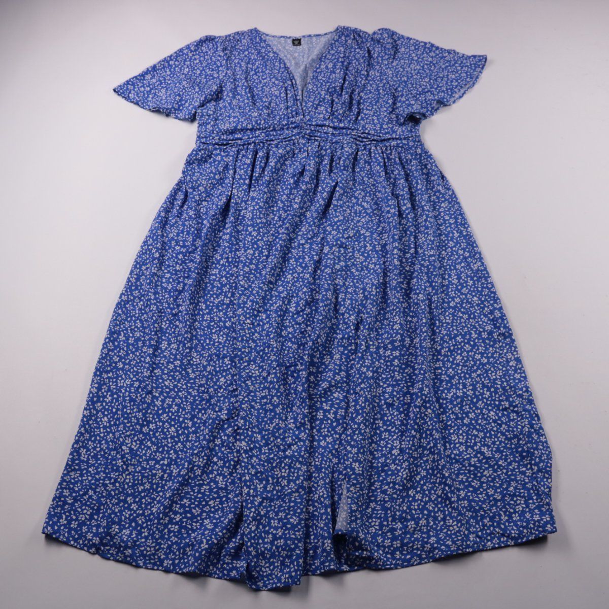 Повседневное платье SHEIN Curve синего цвета с мелким белым цветочным принтом, V-образным вырезом и короткими рукавами. Завышенная линия талии со сборкой делает силуэт более комфортным и подойдёт для прогулок и повседневной носки в тёплую погоду. Практичный плюс — ткань из полиэстера проста в уходе и быстро сохнет.