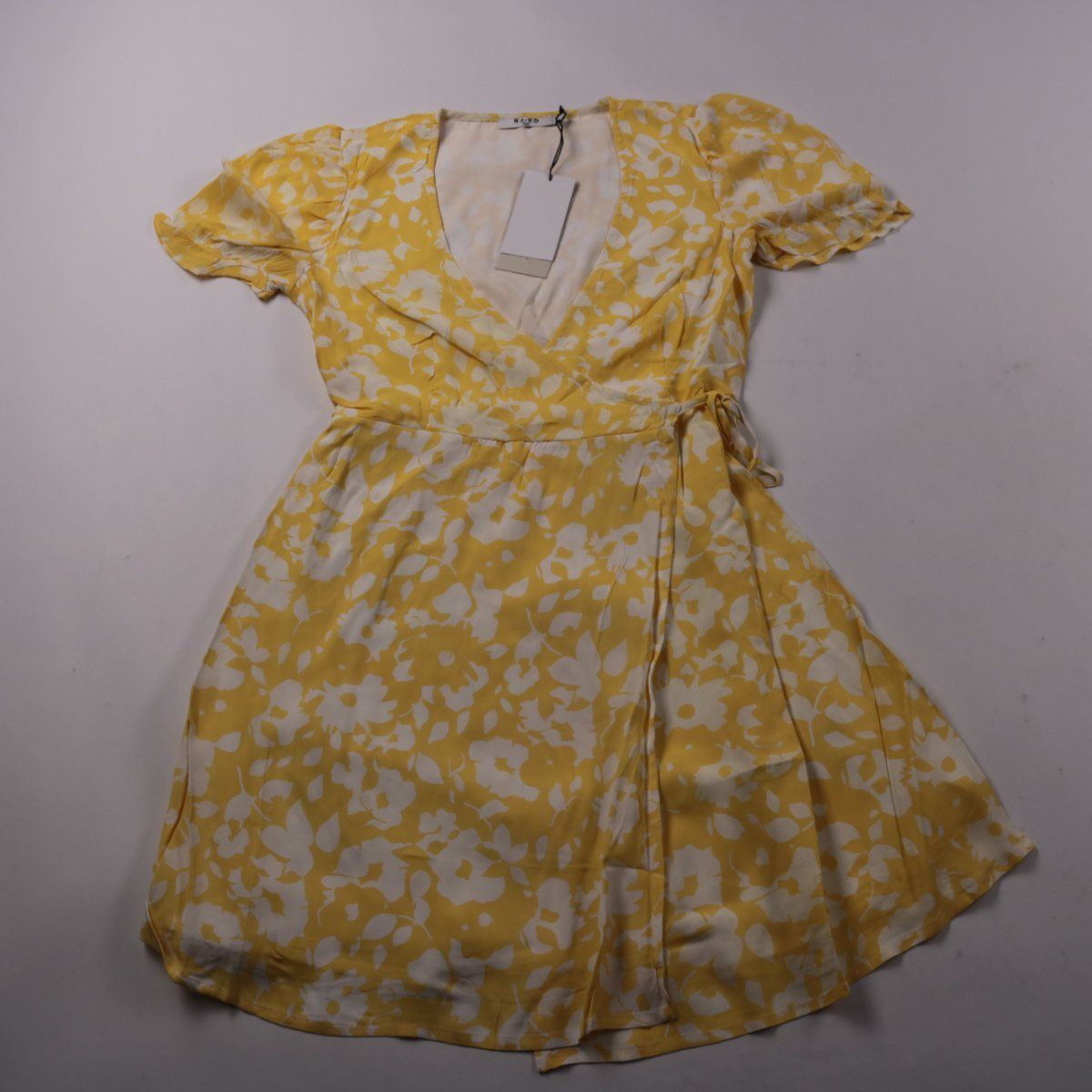Повседневное платье NA-KD жёлтого цвета с белым цветочным принтом, короткими рукавами и запахом на завязках. Подойдёт для прогулок и летних встреч, хорошо сочетается с сандалиями или кедами. Лёгкая вискоза комфортна в тёплую погоду и красиво драпируется.