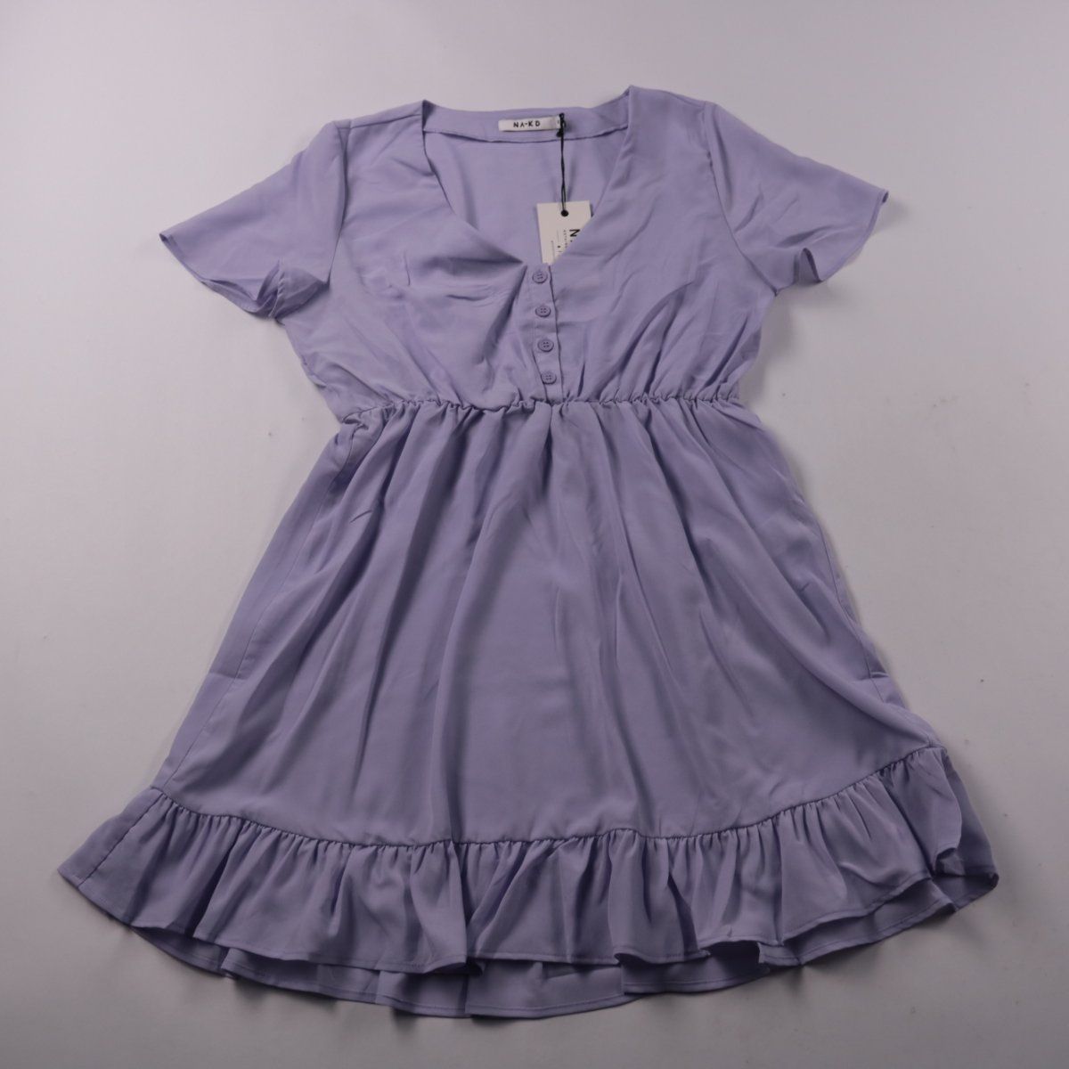 Повседневное платье NA-KD лавандового цвета с V-образным вырезом, короткими рукавами и пуговицами спереди. Приталенная посадка за счёт резинки на талии и юбка с воланом подойдут для прогулок и летних встреч. Лёгкая ткань из полиэстера быстро сохнет и почти не мнётся.