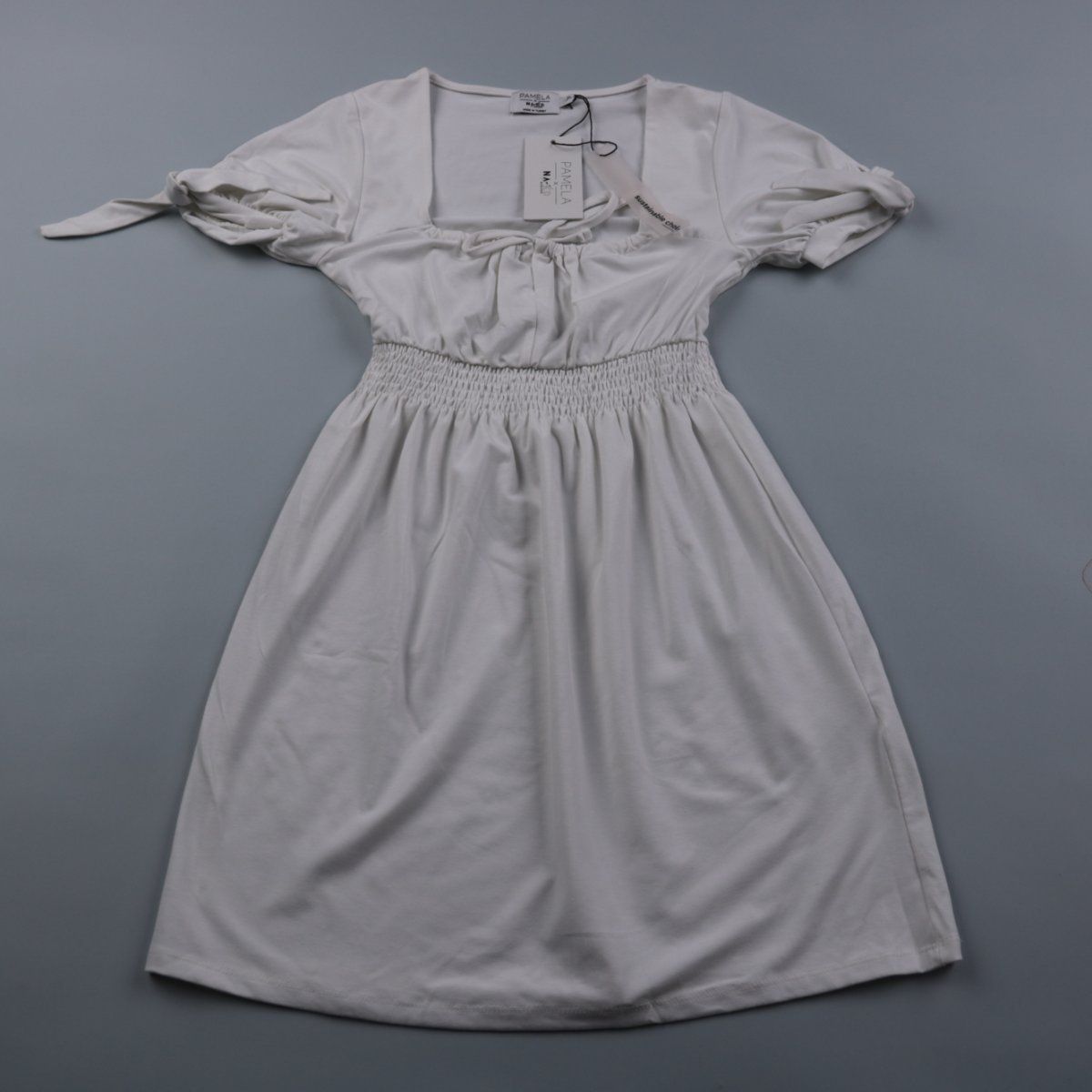 Повседневное платье PAMELA x NA-KD белого цвета с квадратным вырезом и завязкой на груди. Рукава короткие, с декоративными завязками, талия на эластичной сборке — удобно для прогулок и повседневных образов. За счёт резинки на талии хорошо садится и не сковывает движения.