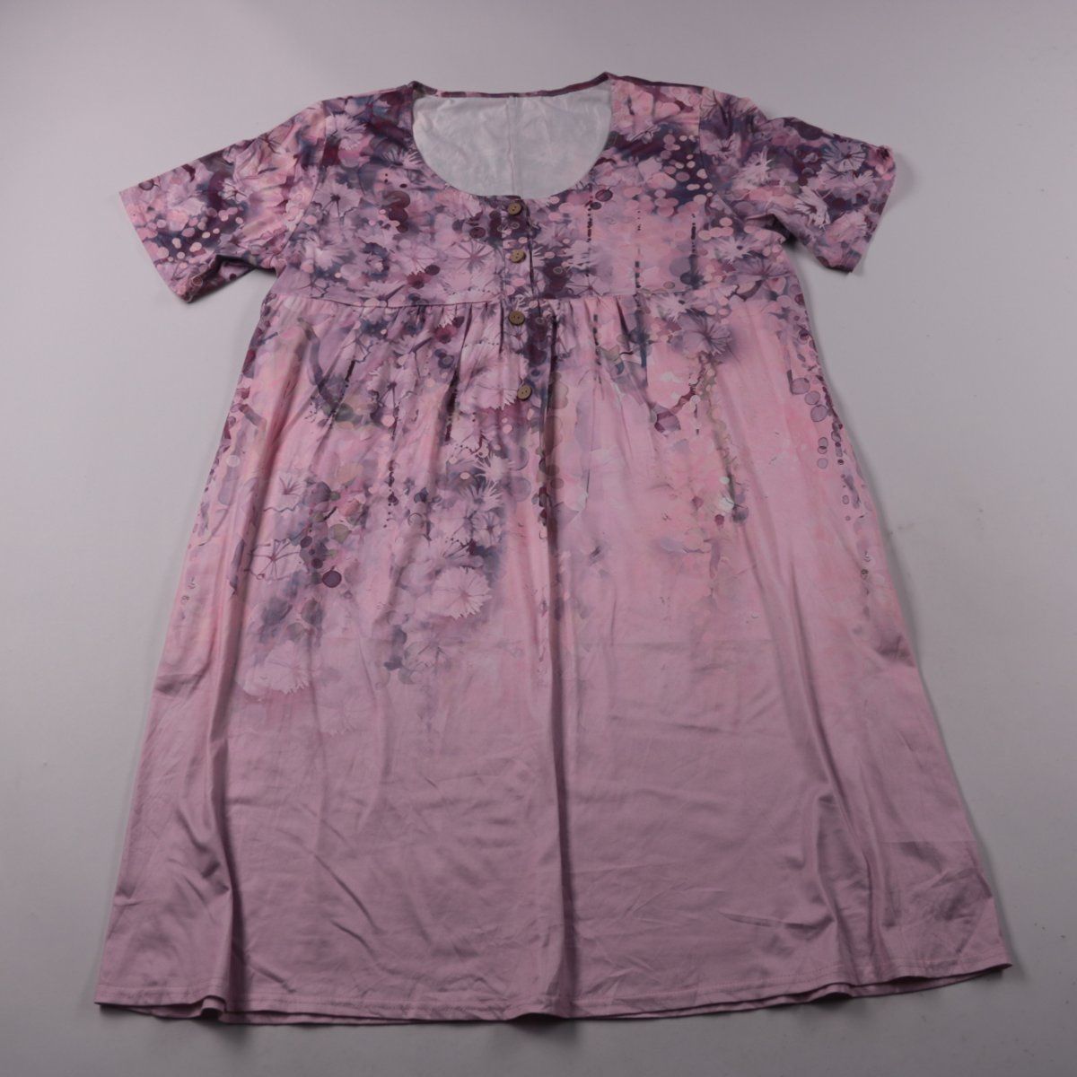 Повседневное платье свободного кроя с коротким рукавом и цветочным принтом в розово-сиреневых тонах, застёгивается на пуговицы спереди. Подойдёт для дома и летних прогулок, посадка комфортная за счёт эластичной ткани. Практично тем, что полиэстер со спандексом меньше мнётся и быстро сохнет.