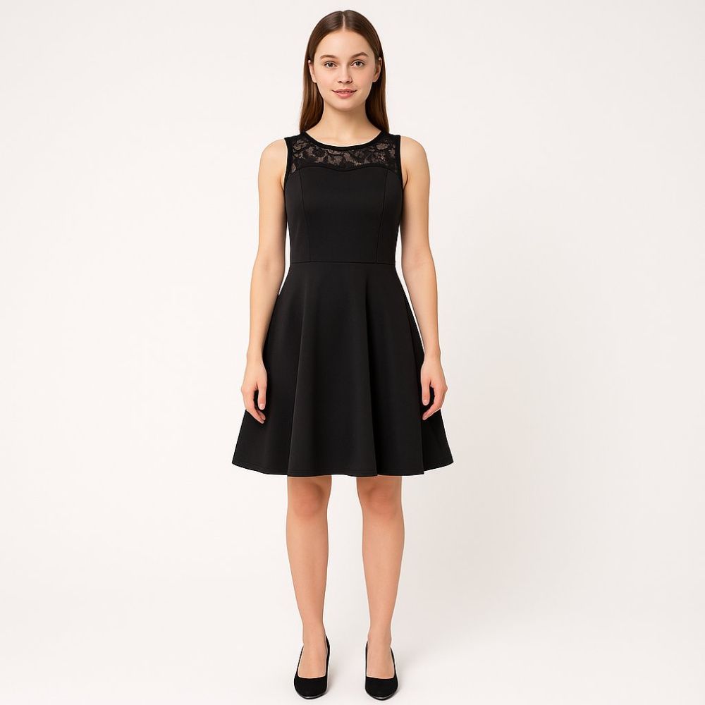 Черное платье Homeyee с кружевной вставкой в зоне декольте и расклешенной юбкой. Подойдет для вечернего выхода, праздника или торжественного мероприятия. Плотная эластичная ткань хорошо держит форму и комфортно садится по фигуре.