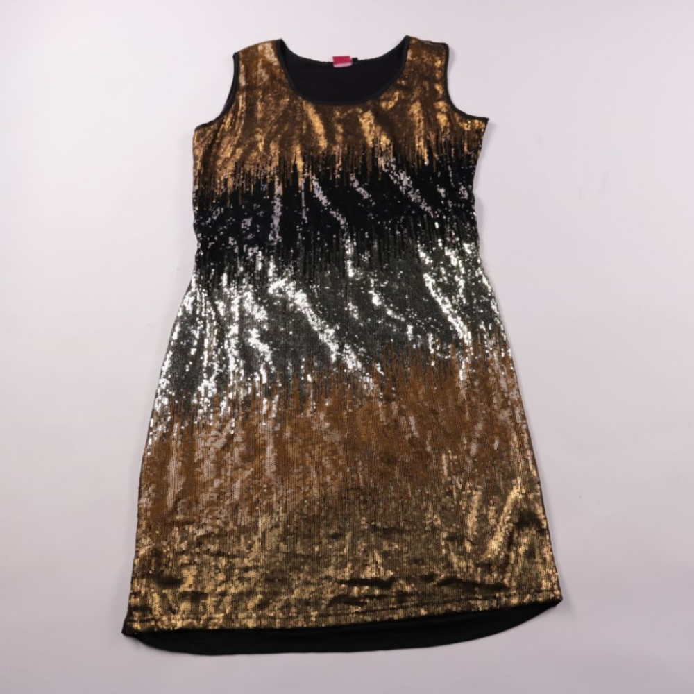 Вечернее платье LIV без рукавов, с блестящими пайетками-градиентом (золото/серебро/чёрный). Подойдёт для праздника, вечеринки или выхода в ресторан, хорошо смотрится с лаконичными аксессуарами. Практичный плюс — эластичная основа и хлопковая подкладка,...