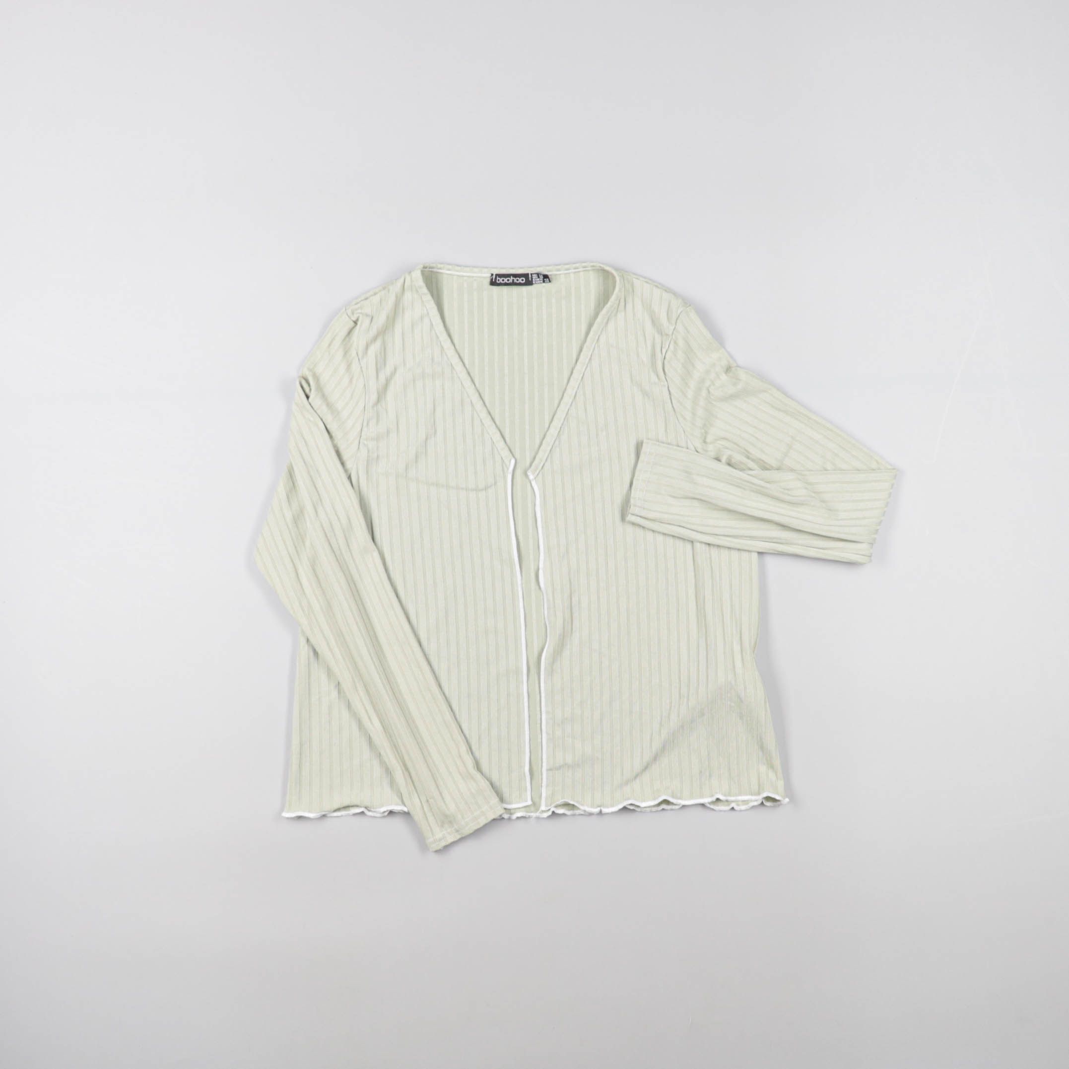 Женская блузка Boohoo светло‑зелёного оттенка в тонкую вертикальную полоску, с V-образным вырезом и длинными рукавами. Подойдёт для повседневных образов и офиса с базовыми брюками или джинсами. Материал мягкий и слегка тянется, поэтому удобно сидит и н...