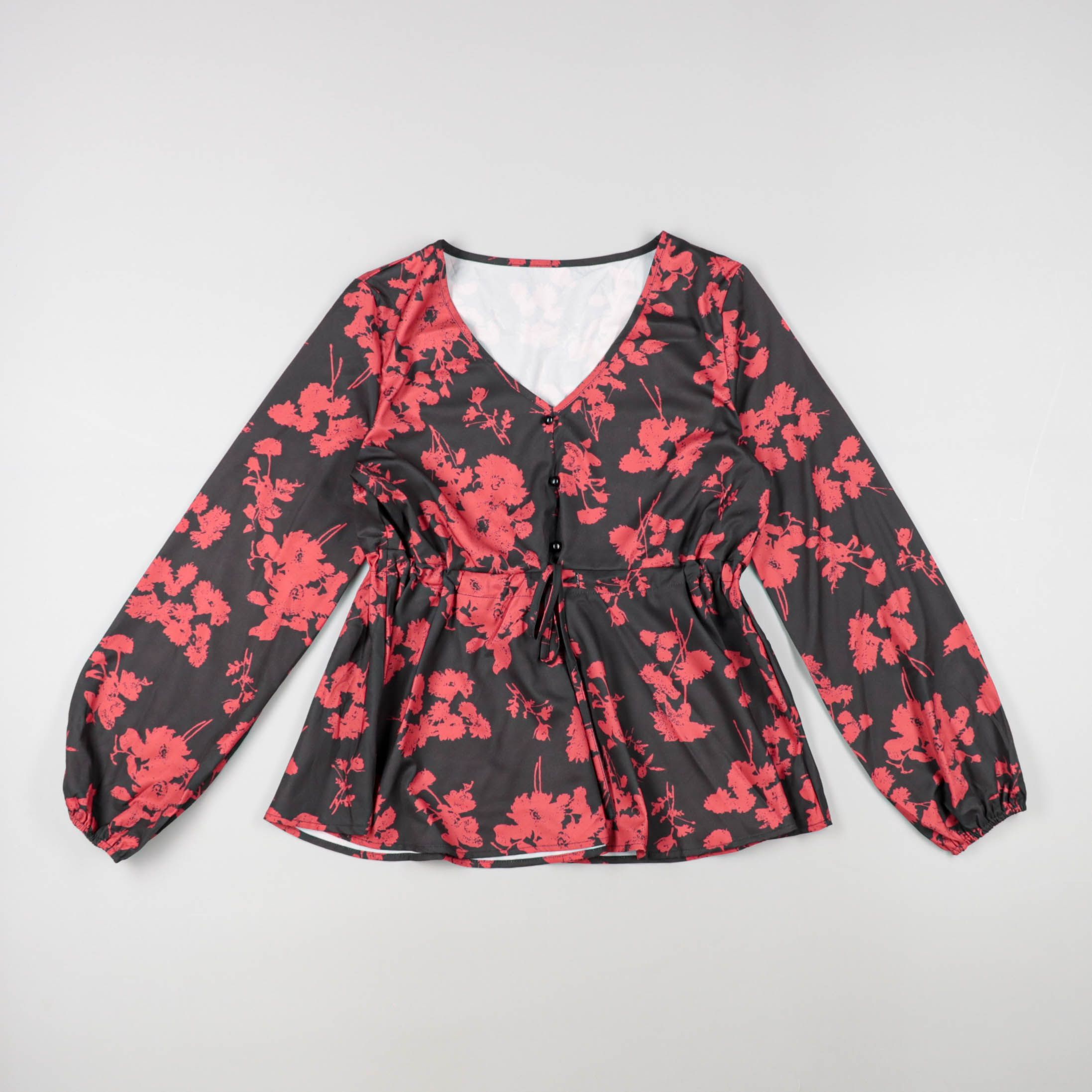 Женская блузка с цветочным принтом на тёмном фоне, с V‑образным вырезом и застёжкой на пуговицы. Длинные рукава на манжетах и кулиска на талии помогают аккуратно подчёркнуть силуэт, подходит для офиса и прогулок. Лёгкая ткань почти не мнётся и удобно н...