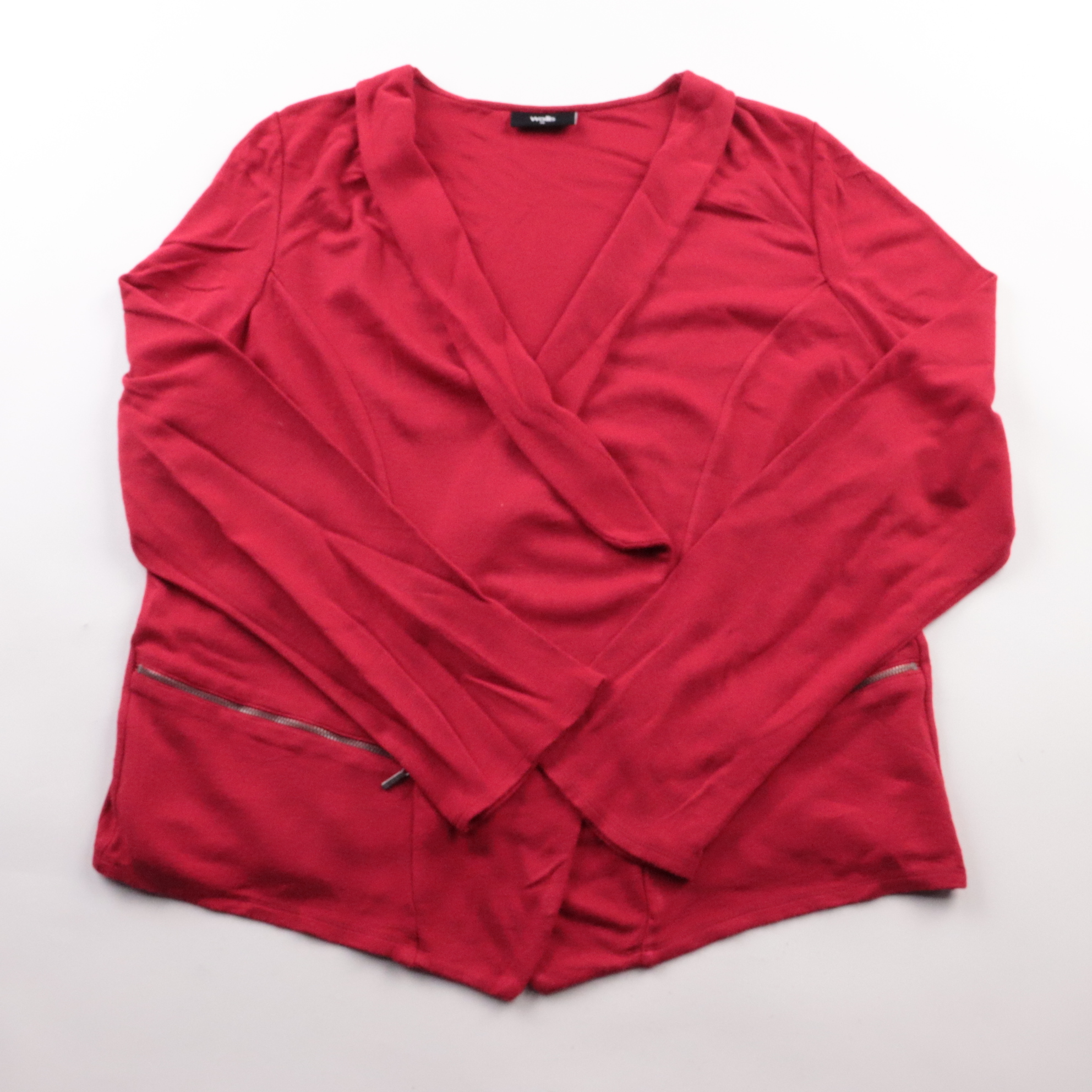 Блузка Wallis красного цвета с запахом и V-образным вырезом, длинный рукав. Подойдёт для офиса и повседневных образов, хорошо сочетается с брюками и юбками. Ткань мягкая и тянется, есть боковые карманы на молнии — удобно для мелочей.