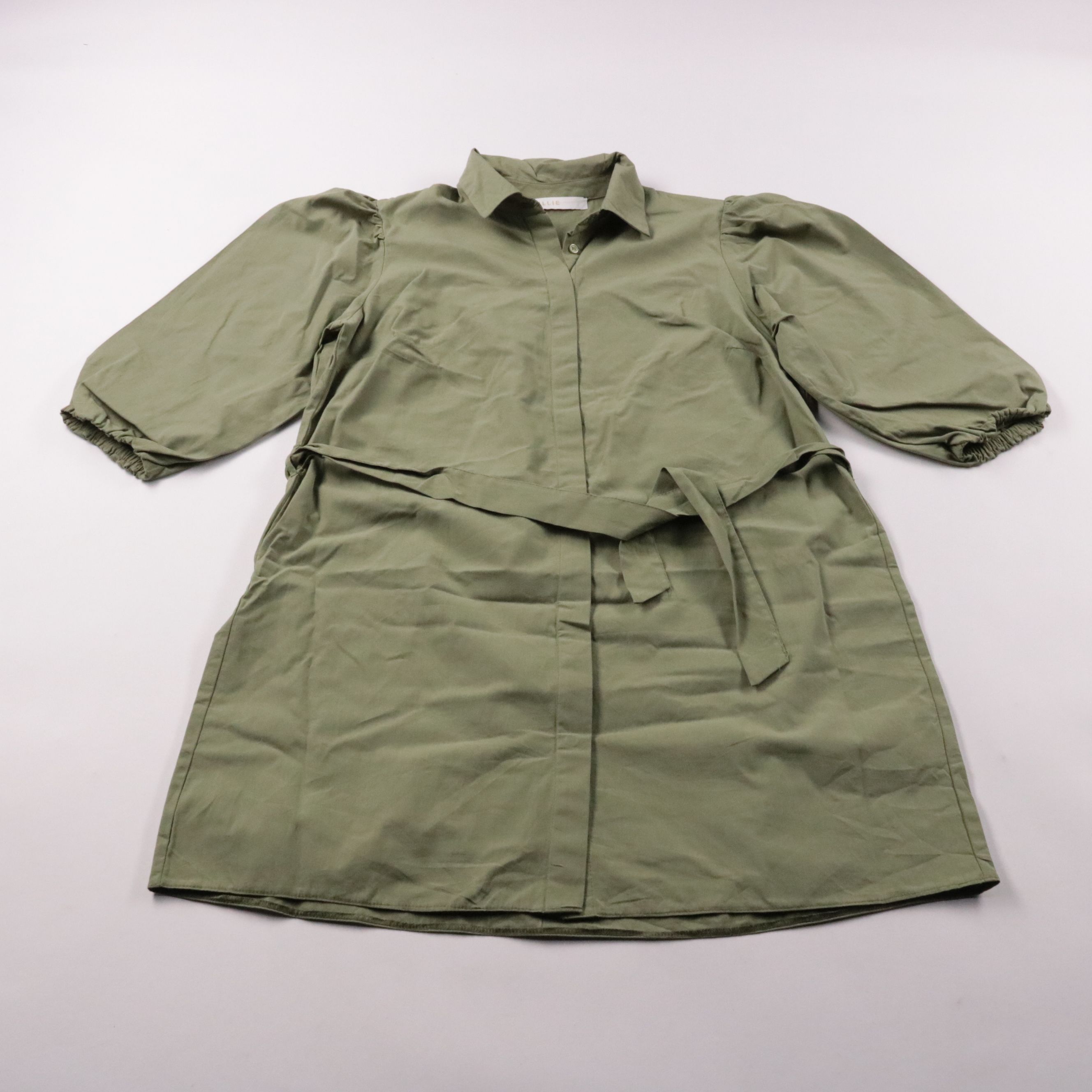 Платье-рубашка Billie цвета хаки с поясом и рукавами-фонариками на манжетах. Подойдёт для повседневных образов и офиса — можно носить как платье или как удлинённую рубашку с брюками. Пояс помогает удобно регулировать посадку по талии.