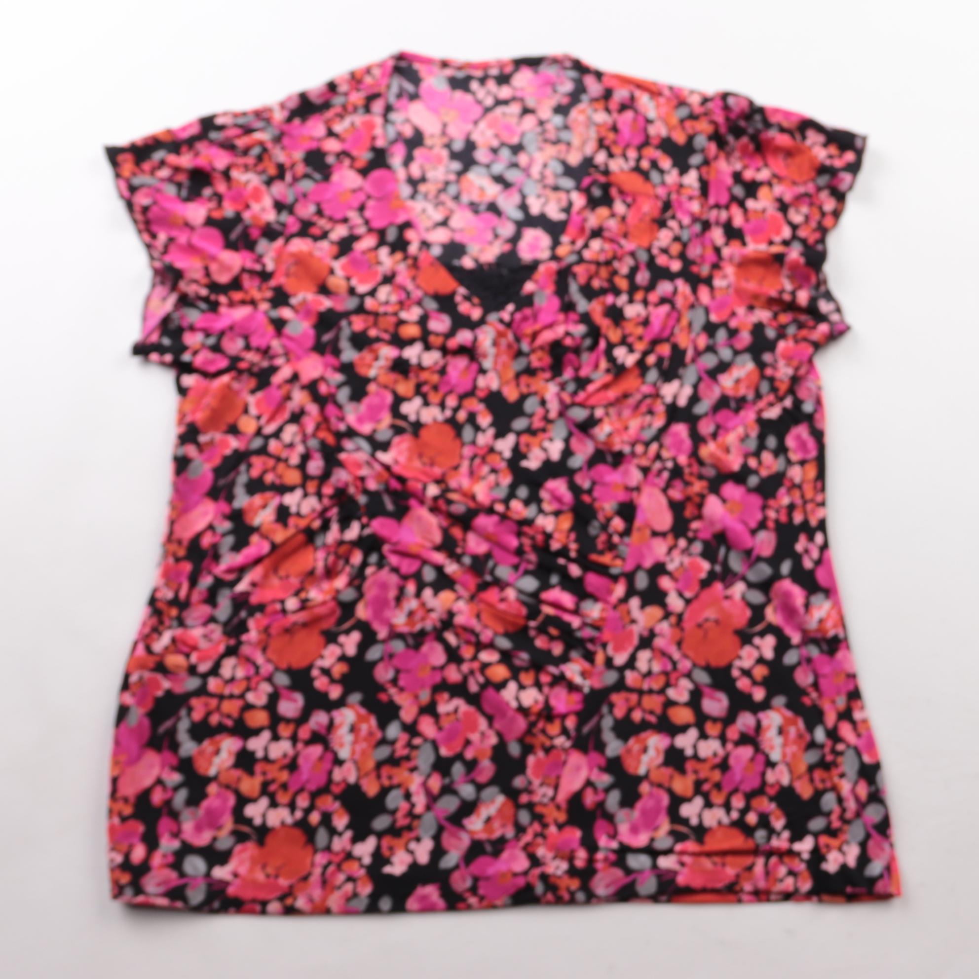 Женская блузка с ярким цветочным принтом на чёрном фоне и V-образным вырезом. Подойдёт для лета и тёплой погоды — на каждый день, в отпуск или на прогулку. Лёгкая ткань и свободный крой делают её комфортной в носке и простой в сочетании с однотонным ни...