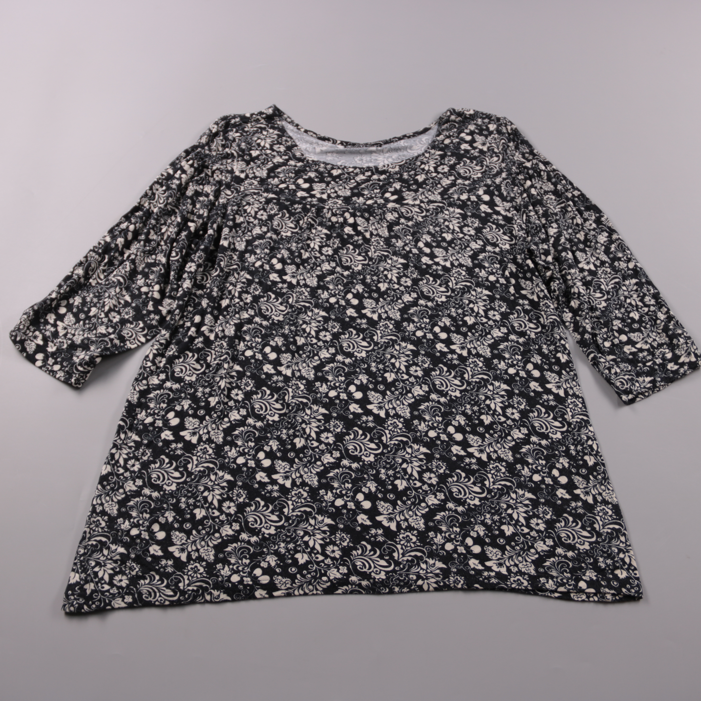 Женская блузка Ternale с чёрно-белым цветочным принтом и рукавом 3/4, свободного прямого кроя. Подойдёт для повседневной носки и офиса с однотонными брюками или джинсами. Ткань эластичная, хорошо садится по фигуре и не сковывает движения.