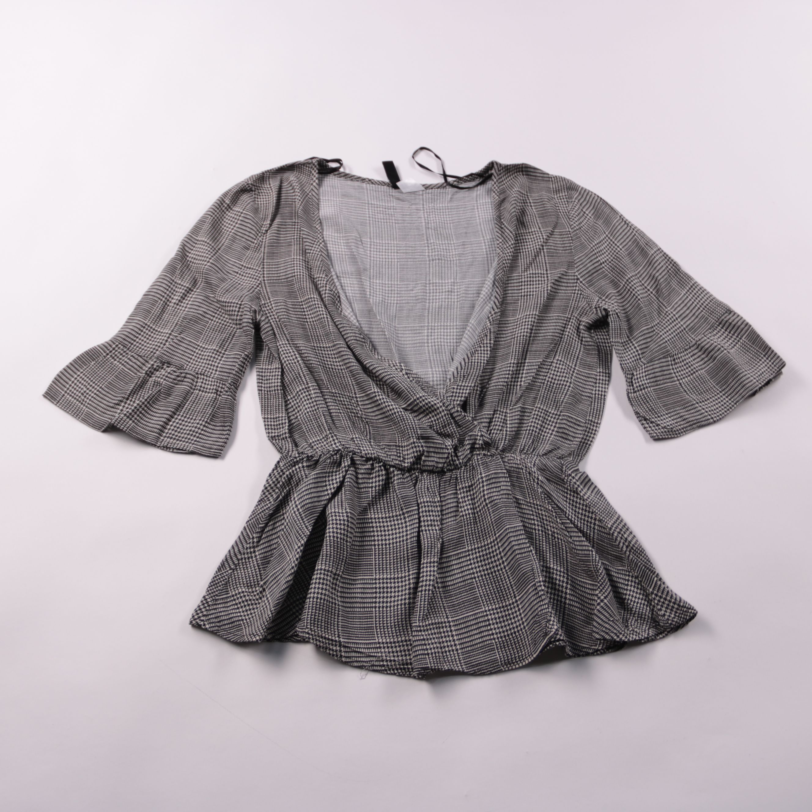 Женская блузка H&M в серую клетку с запахом и V-образным вырезом, с рукавом 3/4 и небольшими воланами. Подойдёт для офиса и повседневных образов с брюками или юбкой, силуэт подчёркивает талию за счёт резинки. Лёгкая вискоза приятно ощущается на коже и ...