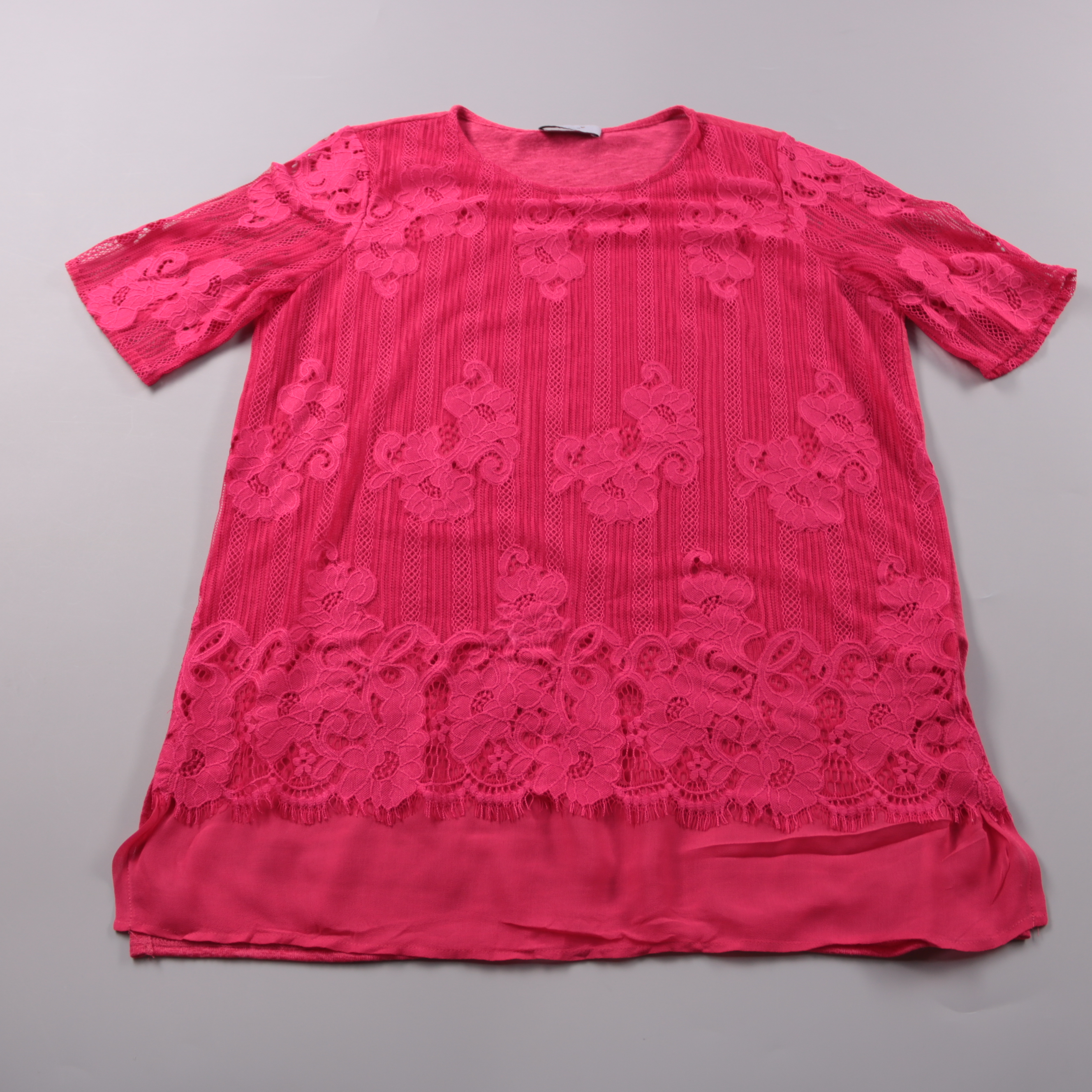 Женская блузка M&S ярко-розового цвета с кружевными вставками и коротким рукавом. Подойдёт для лета и тёплой погоды, хорошо смотрится и с джинсами, и с юбкой. Лёгкая ткань из полиэстера и вискозы быстро сохнет и проста в уходе.