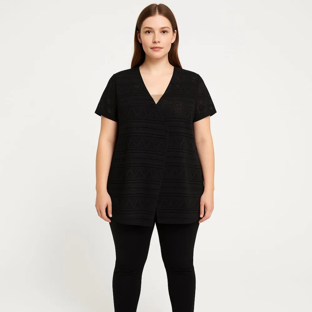 Женская блузка Laura T. Classic из фактурного материала с ажурными вставками и V-образным запахом. Подойдёт для повседневных и офисных образов, хорошо сочетается с брюками и легинсами. Практична в уходе: ткань из полиэстера быстро сохнет и меньше мнётся.