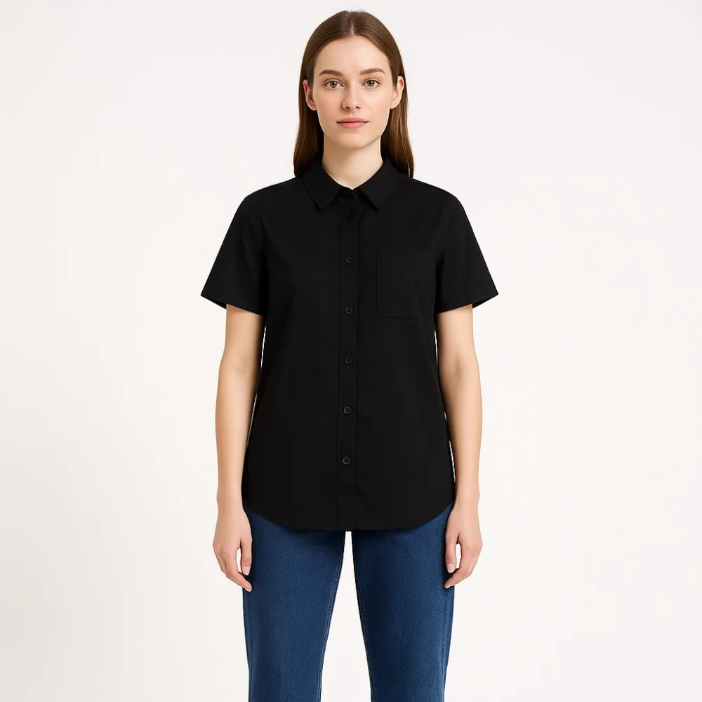 Женская рубашка Cinema Club чёрного цвета с коротким рукавом и застёжкой на пуговицы. Подойдёт для офиса и повседневных образов, легко сочетается с джинсами и брюками. Практичный плюс — базовый цвет и лаконичный крой, которые не выходят из моды.