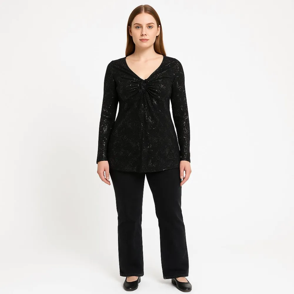 Женская чёрная блузка из эластичной ткани с лёгким мерцанием и драпировкой/узлом по центру груди. Подойдёт для вечерних выходов и на каждый день с брюками или юбкой, хорошо садится по фигуре. Материал тянется и комфортно носится, не сковывает движения.