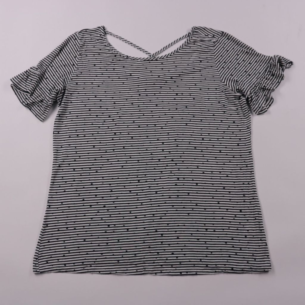 Женская блузка Gina в чёрно-белую полоску с мелким принтом, короткими рукавами и вырезом с декоративными завязками сзади. Подойдёт для повседневной носки и офиса в тёплую погоду, легко сочетается с джинсами и юбками. Вискоза с эластаном приятная к телу...