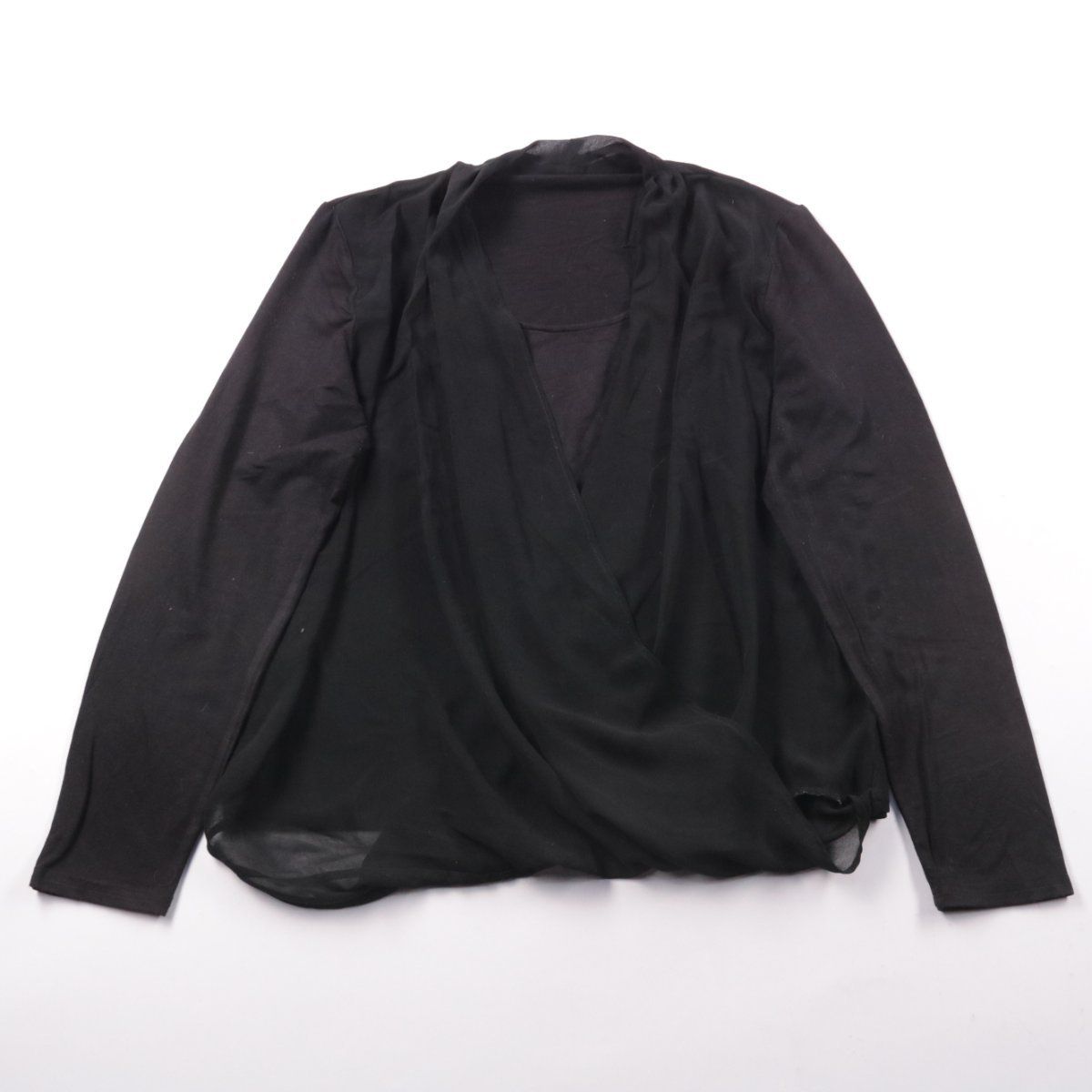 Чёрная блузка с запахом и длинными рукавами, лёгкая и полупрозрачная. Подойдёт для повседневных и вечерних образов, красиво смотрится с топом или бельевым бра. Практична тем, что легко комбинируется с юбками и брюками.