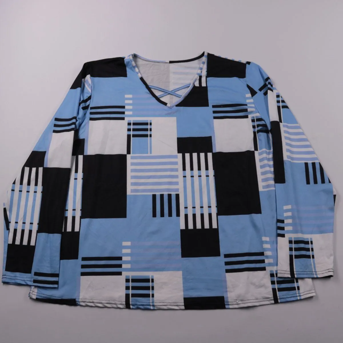 Блузка с геометрическим принтом в голубых, белых и чёрных тонах, с V‑образным вырезом и декоративной шнуровкой спереди. Подойдёт для повседневных образов и офиса с однотонным низом. Ткань эластичная, почти не мнётся и удобна в носке.