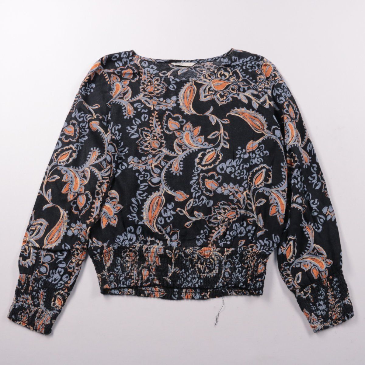Блузка Only с длинным рукавом и растительным принтом в чёрно-оранжево-серой гамме, с эластичной сборкой по низу и манжетам. Подойдёт для повседневных образов и офиса с базовыми брюками или юбкой. Практичный плюс — мягкая вискоза и эластан дают комфортную посадку и не сковывают движения.