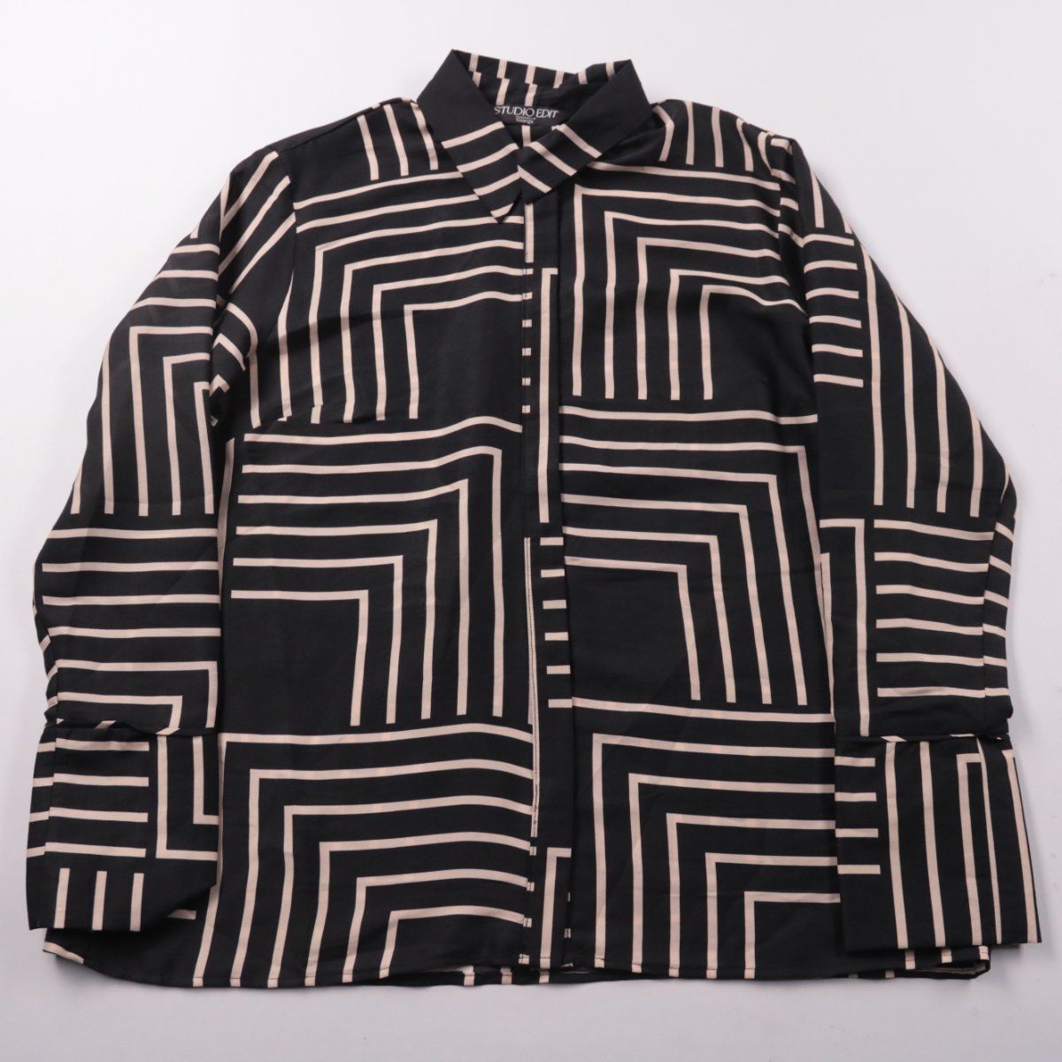 Блузка Studio Edit с геометрическим принтом в чёрно-бежевых тонах и отложным воротником. Подойдёт для офиса и повседневных образов с брюками или джинсами. Полиэстер практичен в уходе и почти не мнётся.