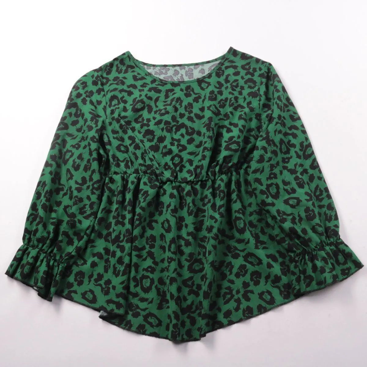 Блузка SHEIN Curve с зелёным леопардовым принтом и сборкой по линии талии (силуэт с баской). Подойдёт для повседневных образов и офиса с однотонными брюками или юбкой. Практичный плюс — лёгкая ткань из полиэстера почти не мнётся и проста в уходе.