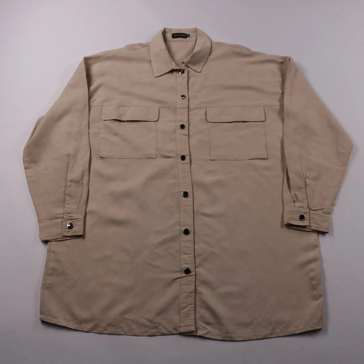 Женская рубашка PrettyLittleThing бежевого цвета с отложным воротником, застёжкой на пуговицы и накладными карманами на груди. Подойдёт для повседневных образов и как лёгкая верхняя рубашка в демисезон. Практичный плюс — ткань из полиэстера проста в уходе и почти не мнётся.