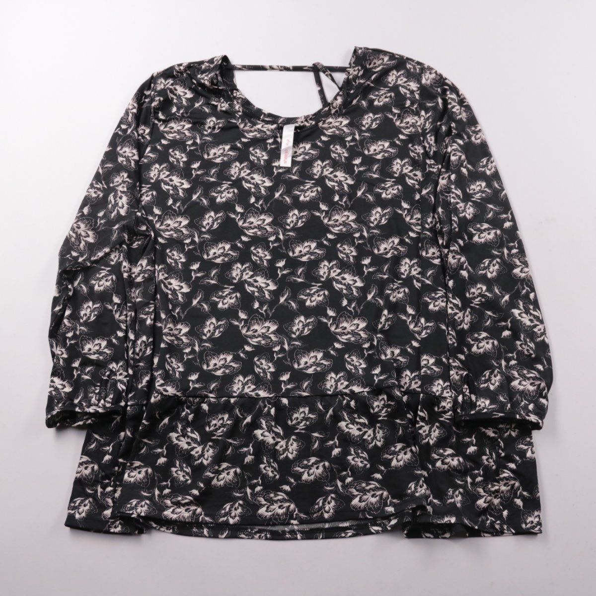 Блузка Sheego чёрного цвета с контрастным цветочным принтом и длинным рукавом. Модель с круглым вырезом и завязками сзади подойдёт для повседневных образов и офиса. Эластичная ткань хорошо тянется и комфортно садится по фигуре.