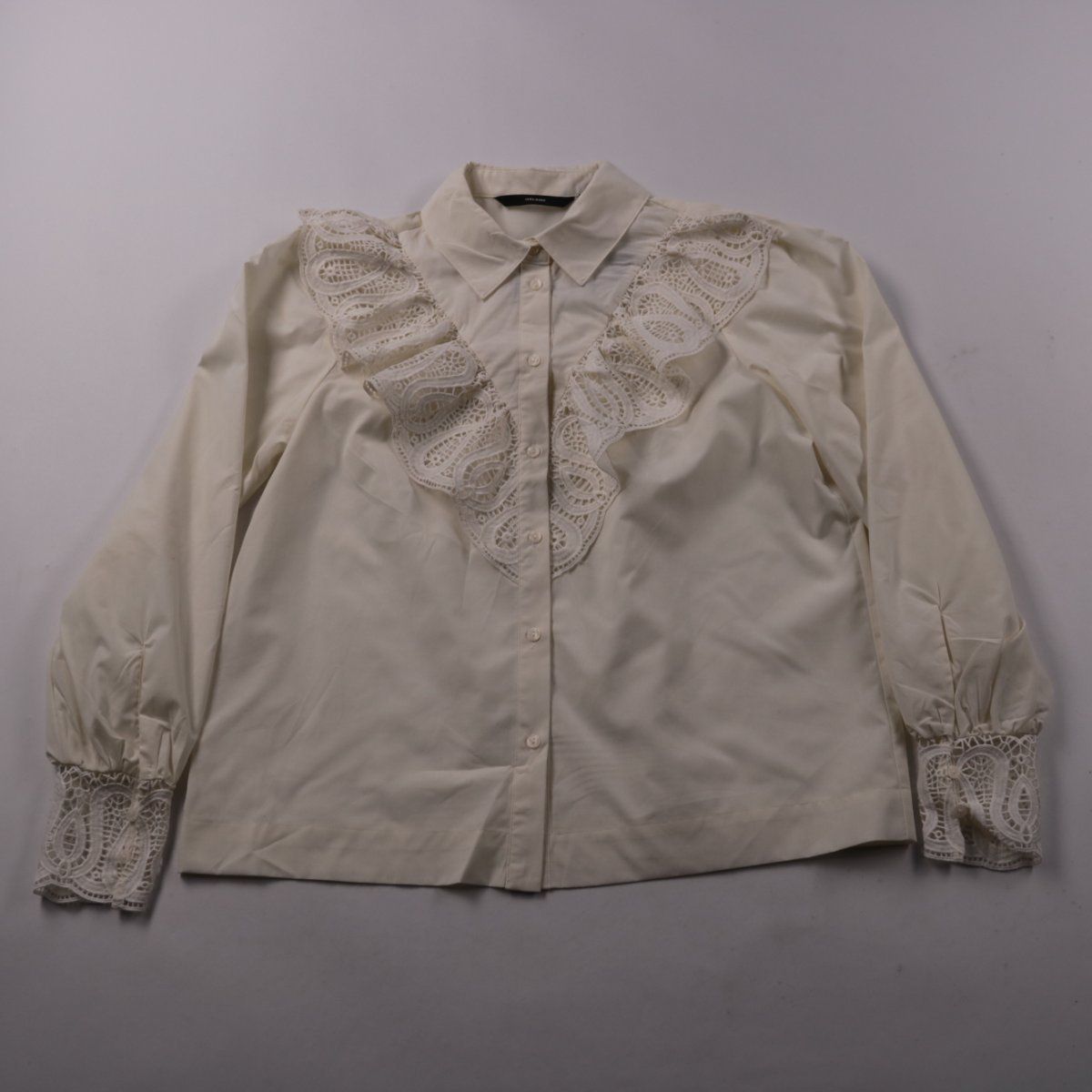 Женская рубашка Vero Moda молочно-белого оттенка с ажурными кружевными воланами спереди и на манжетах. Подойдёт для офиса и аккуратных повседневных образов, хорошо сочетается с брюками и юбками. Практичный плюс — длинный рукав и застёжка на пуговицы позволяют удобно регулировать посадку и стиль.