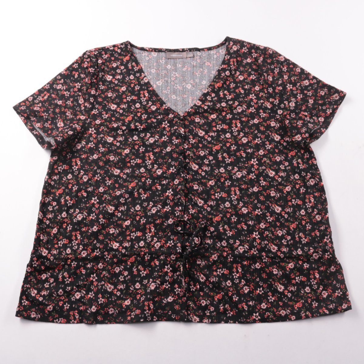 Женская блузка Sussan с V-образным вырезом и короткими рукавами, выполнена из ткани с мелким цветочным принтом. Подойдёт для тёплой погоды и повседневных образов, хорошо сочетается с джинсами и однотонными юбками. Материал эластичный, поэтому посадка комфортная.