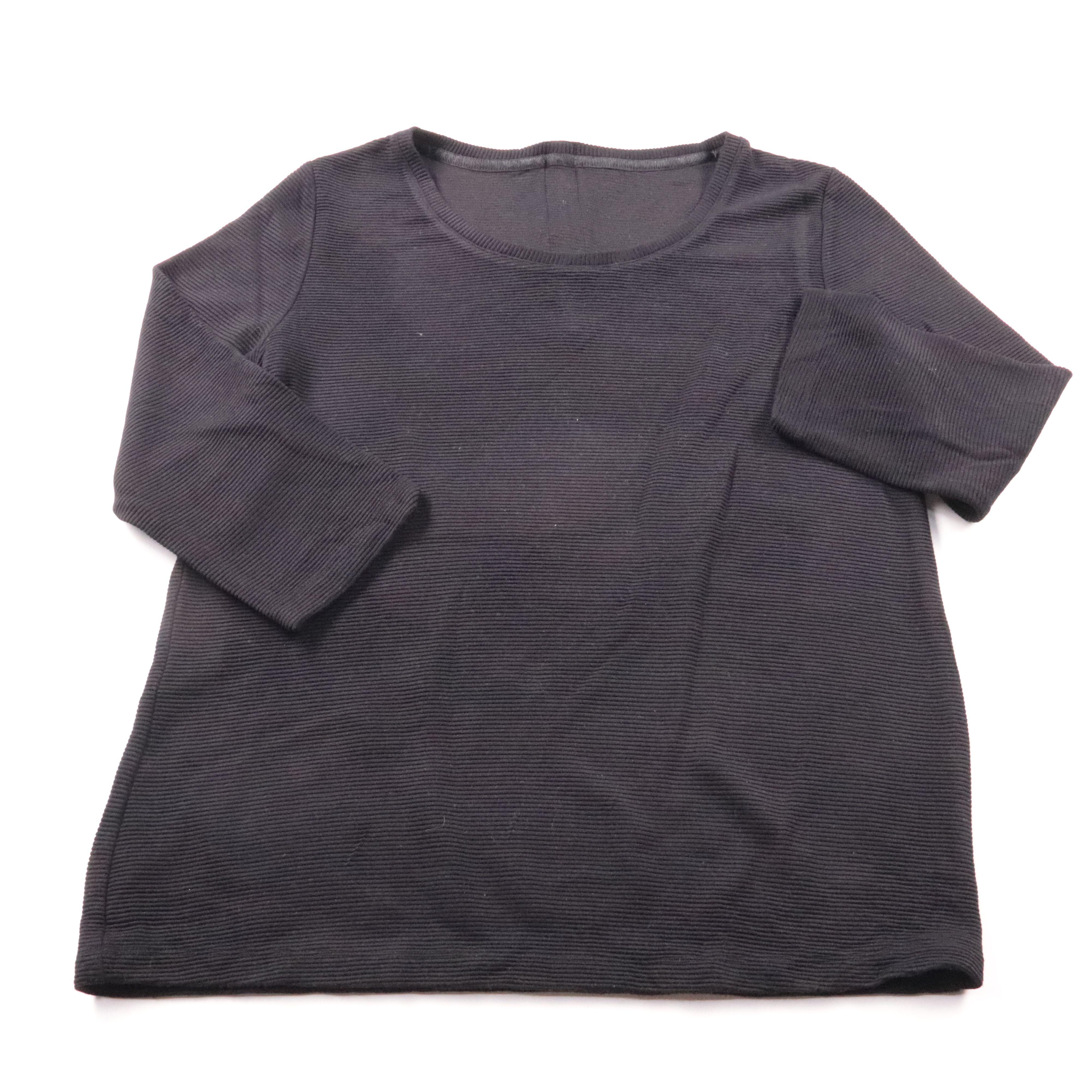 Чёрный женский свитшот в рубчик с круглым вырезом и рукавом 3/4. Подойдёт для повседневных образов и офисного кэжуала, легко сочетается с джинсами и юбками. Практичный тёмный цвет и фактурная ткань делают вещь удобной на каждый день.