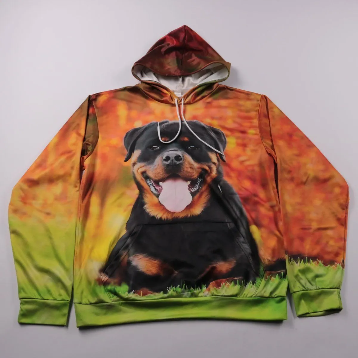 Толстовка с капюшоном и ярким принтом ротвейлера на фоне осенних оттенков. Подойдёт для повседневной носки и прогулок, хорошо сочетается с джинсами и спортивными брюками. Материал с добавлением спандекса тянется и комфортно садится по фигуре.